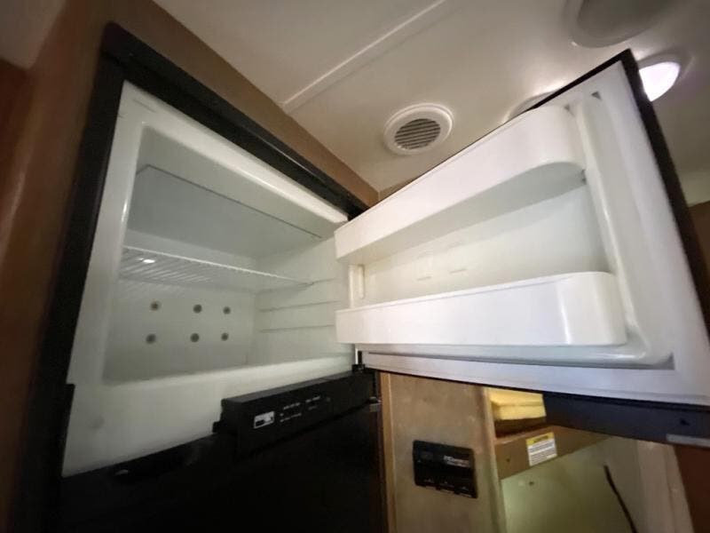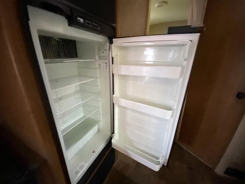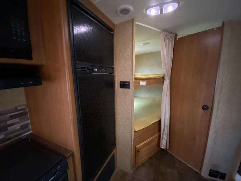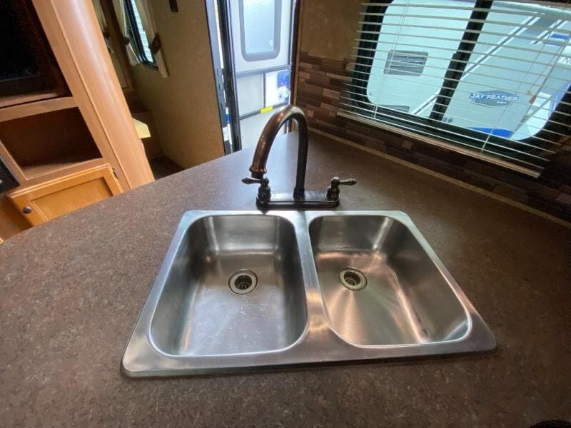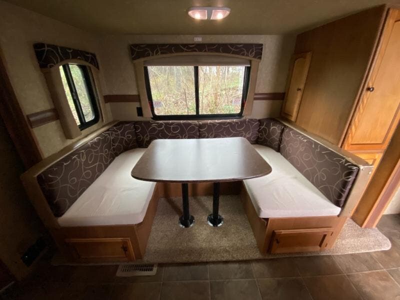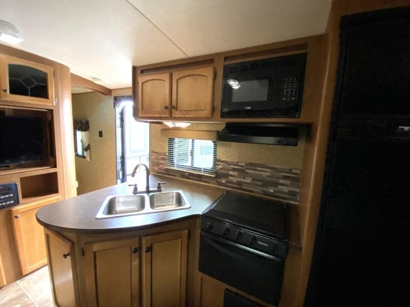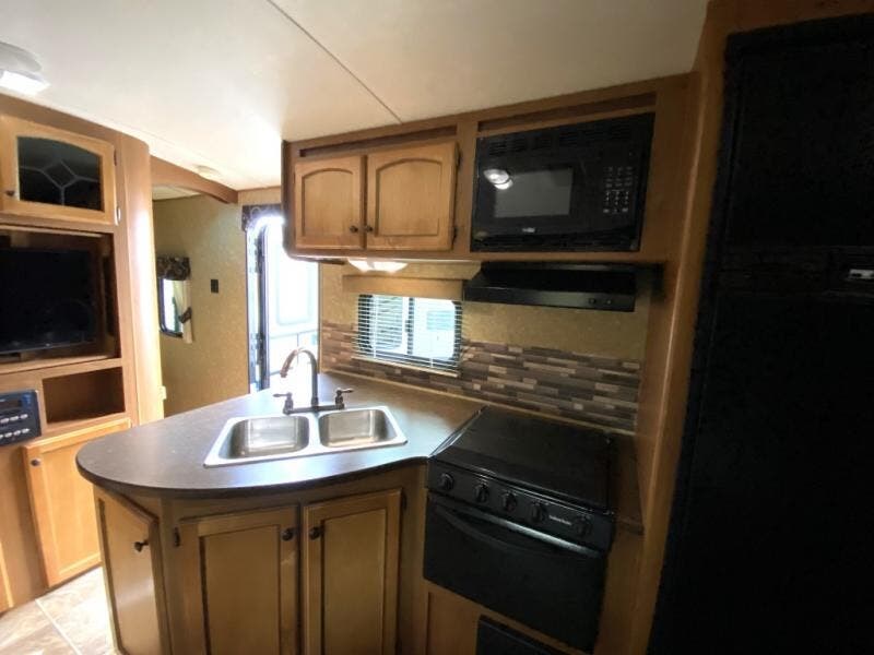 As you enter the travel trailer, to the left is a double kitchen sink, three burner range, microwave, and refrigerator. The opposite side of the travel trailer has a u-dinette, wardrobe and pantry slide. You are sure to enjoy the entertainment center that is located in the front of the living area.