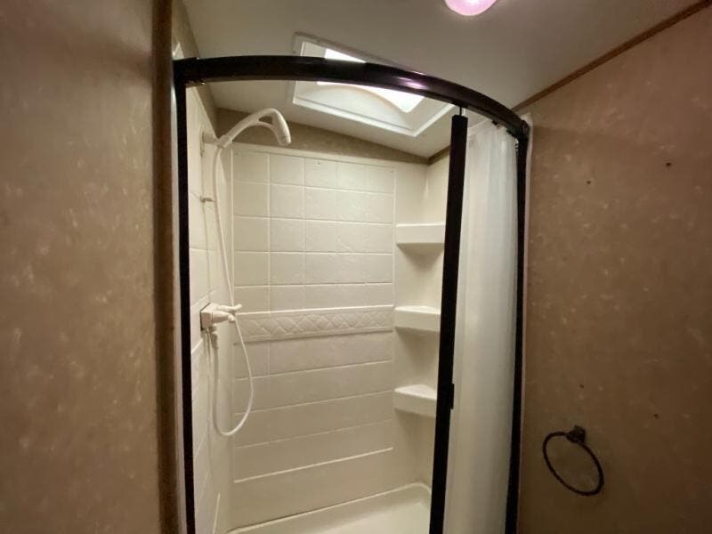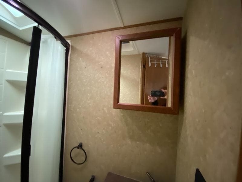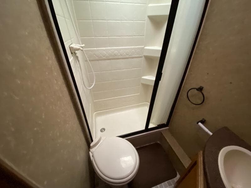 The bathroom is located in the rear and inside the bath there is a toilet, shower, sink, and medicine cabinet.