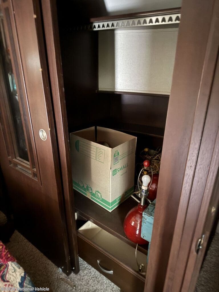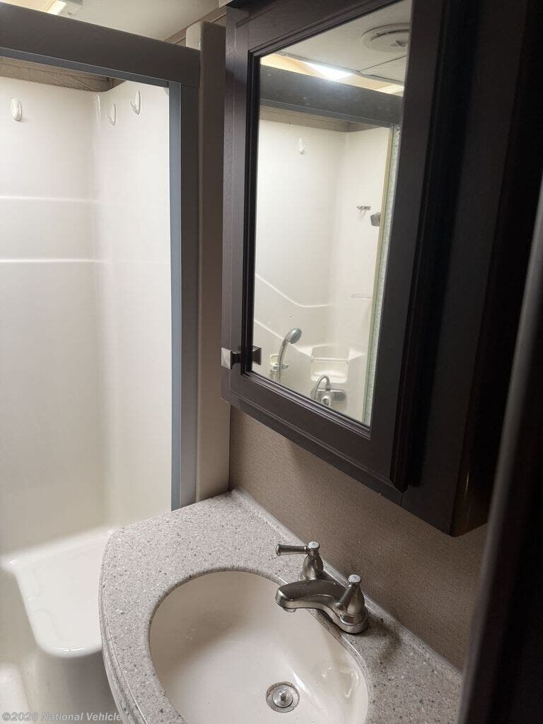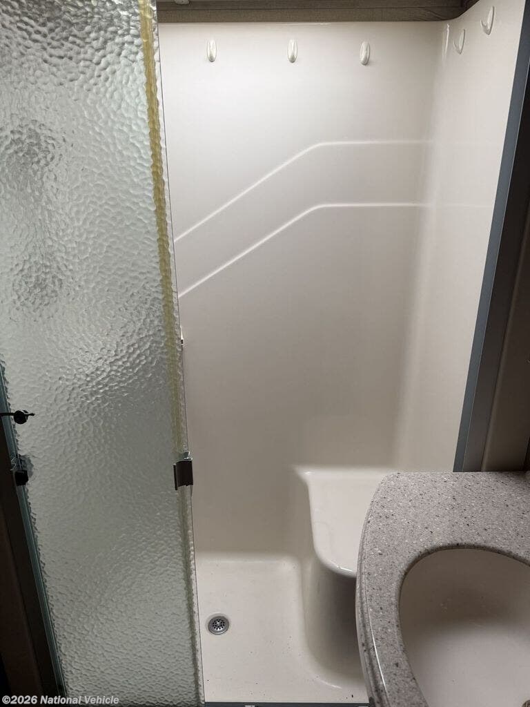Moving forward, the side aisle bathroom offers a spacious rectangular shower, vanity, toilet, and linen storage?well-appointed for life on the road. The front private bedroom is equally impressive, featuring a queen bed slide with nightstands, a dresser with overhead TV, and a large front wardrobe with sliding doors. Washer/dryer prep adds even more practicality for extended travel.