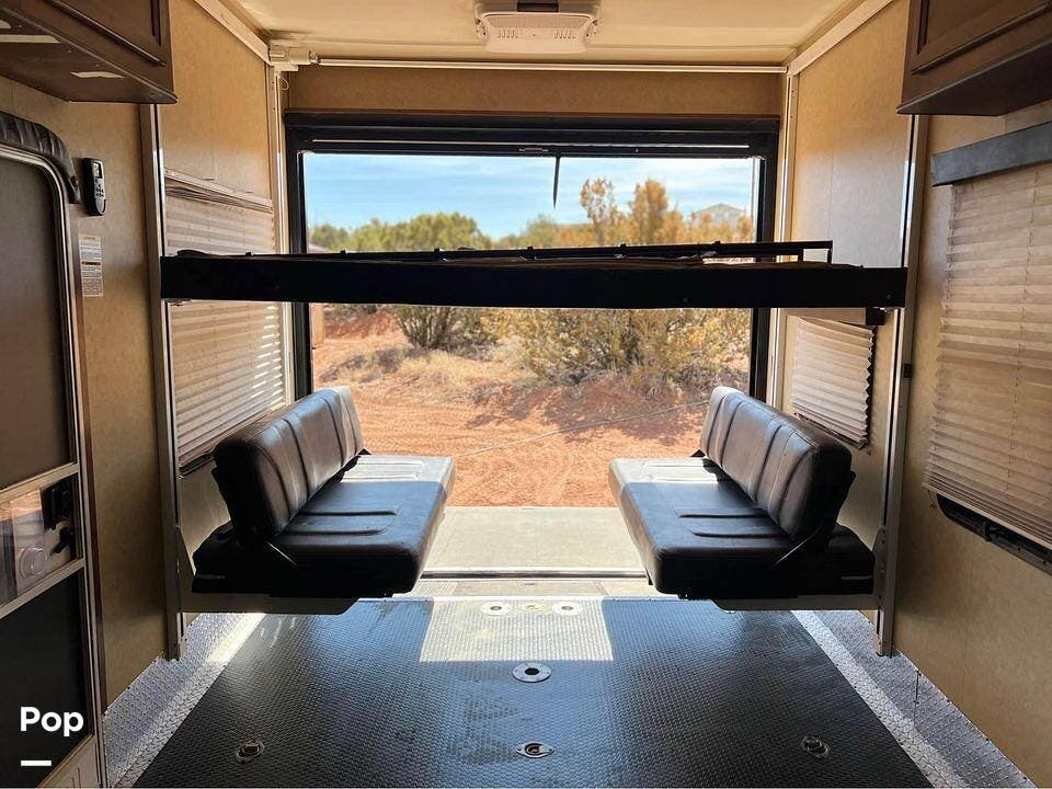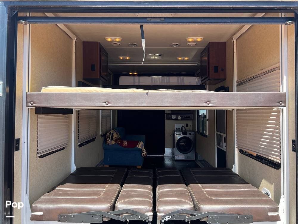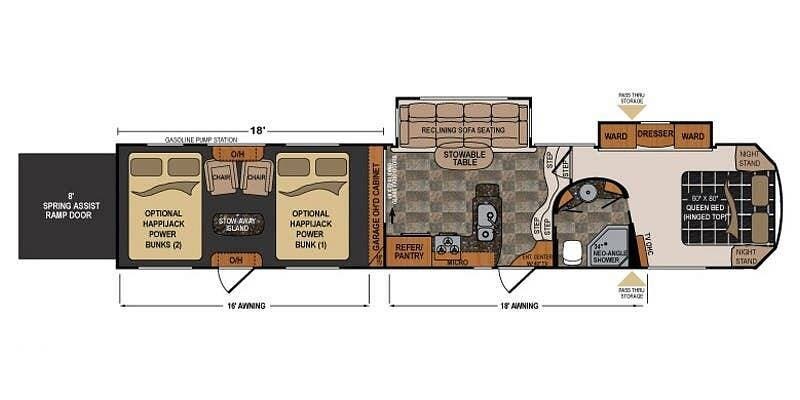 It has an 18-foot garage area with two drop-down beds and two sleeper sofas, and the rear ramp makes into a patio