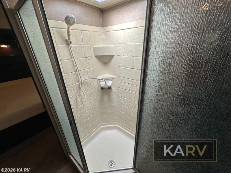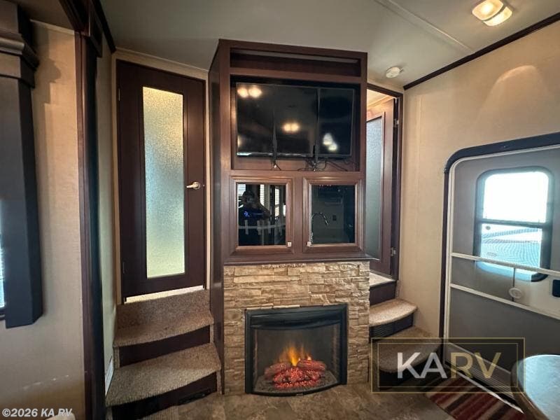 Along the road side wall find a slide out reclining sofa lounge (UPGRADED to a lazy boy recliner) with a stowable table. A nice entertainment center with storage cabinets and a fireplace below are featured on the exterior bath wall and can be easily viewed from the lounge seating in the room.