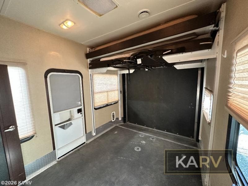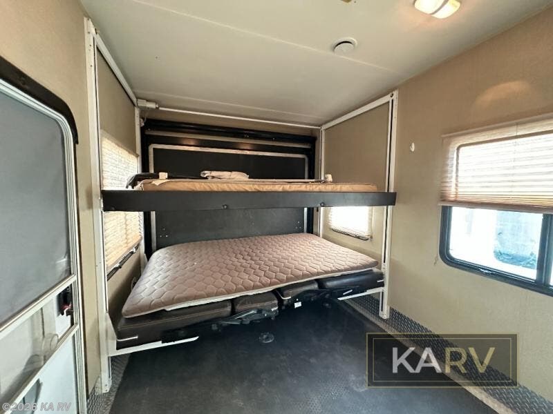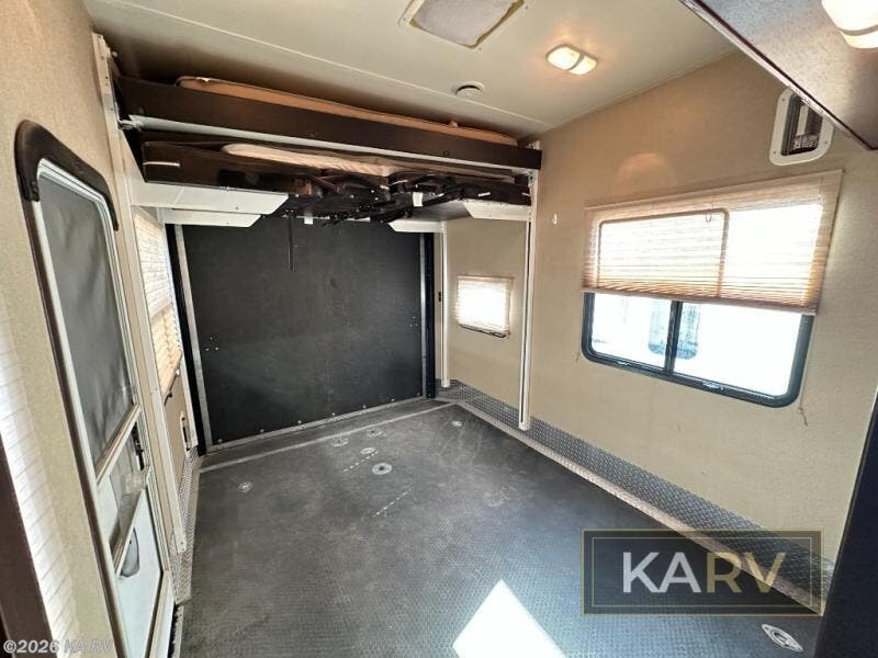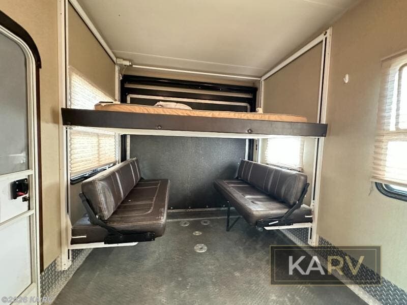 The 8' spring assist ramp door will make loading and unloading easy into the 12' cargo garage space where you will find tie downs to secure your things as you travel, along with a great space that becomes living area once you reach your destination and the cargo is removed. There is a 40" x 88" twin loft bed, with a Happi-Jack bunk system.