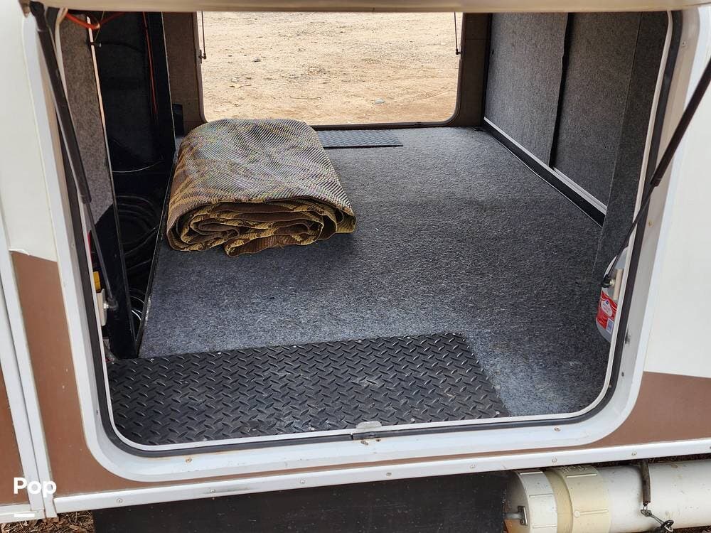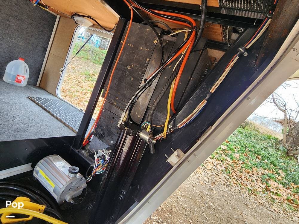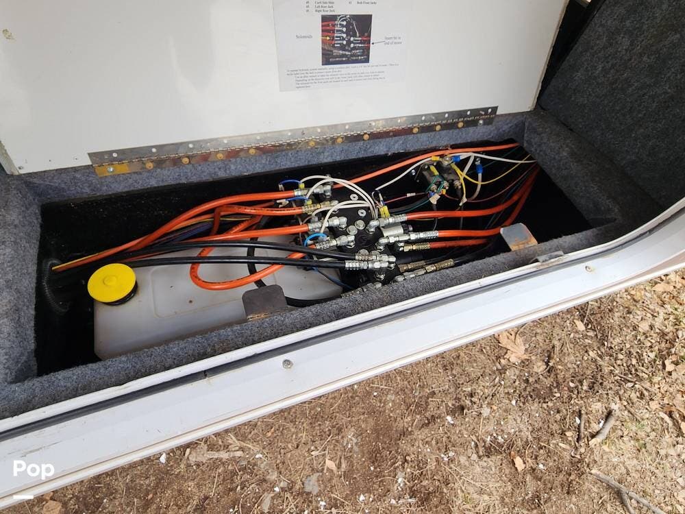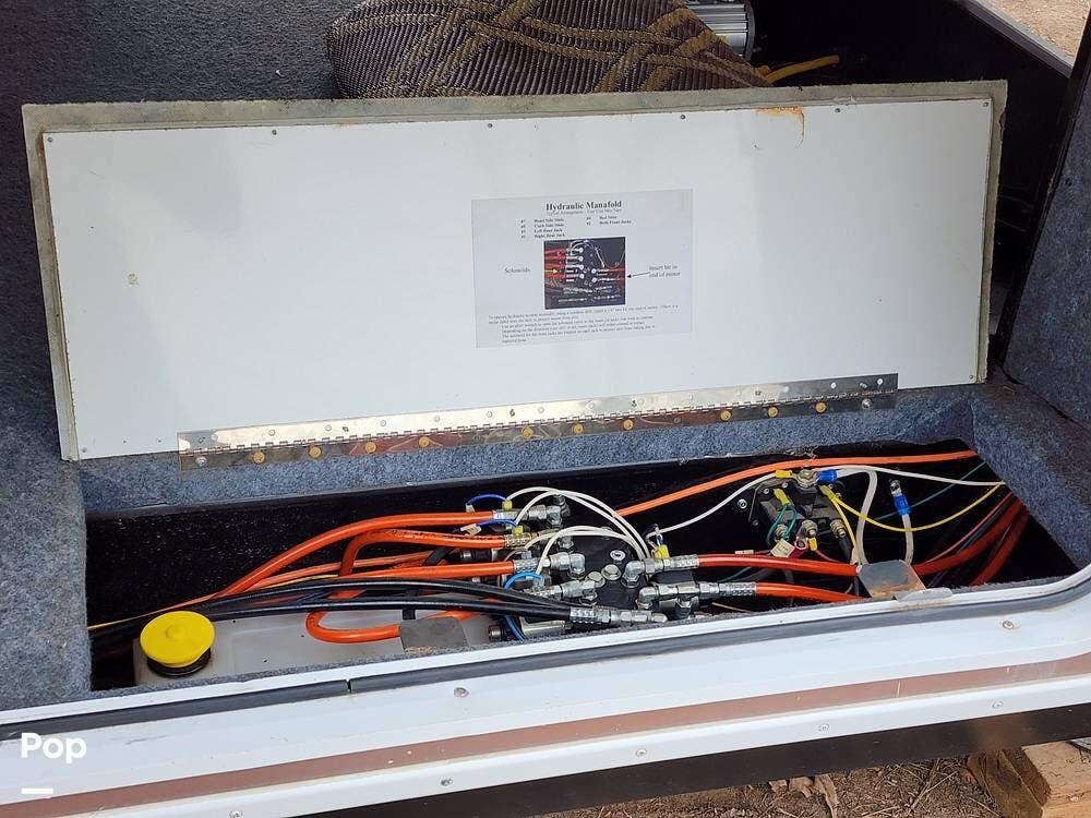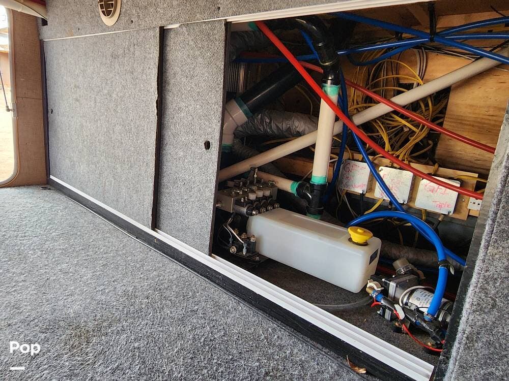 Among the things I really like are the sliding doors in the exterior pass through storage that allow easy access to important systems like the water pump, hydraulics, etc. There are hinged floor panels on either side of the pass through for easy access to the house batteries and to the hydraulic control system. This also opens storage in the front compartment where the bulky batteries are often installed.