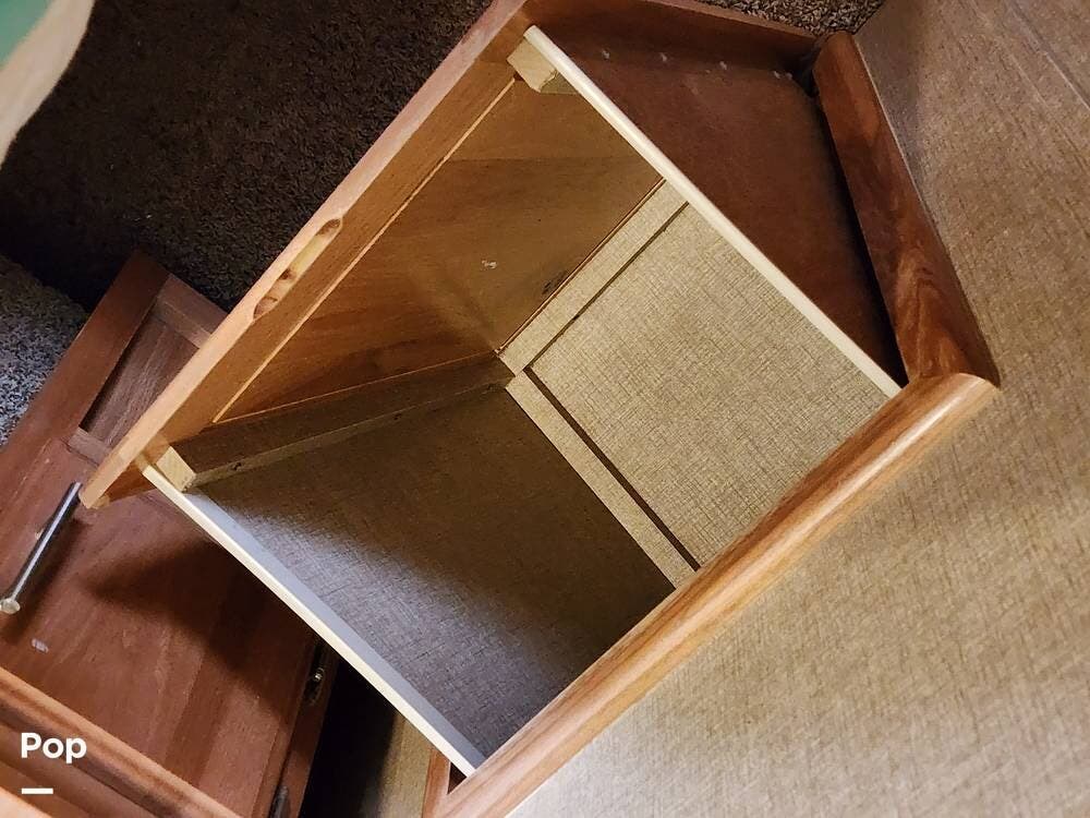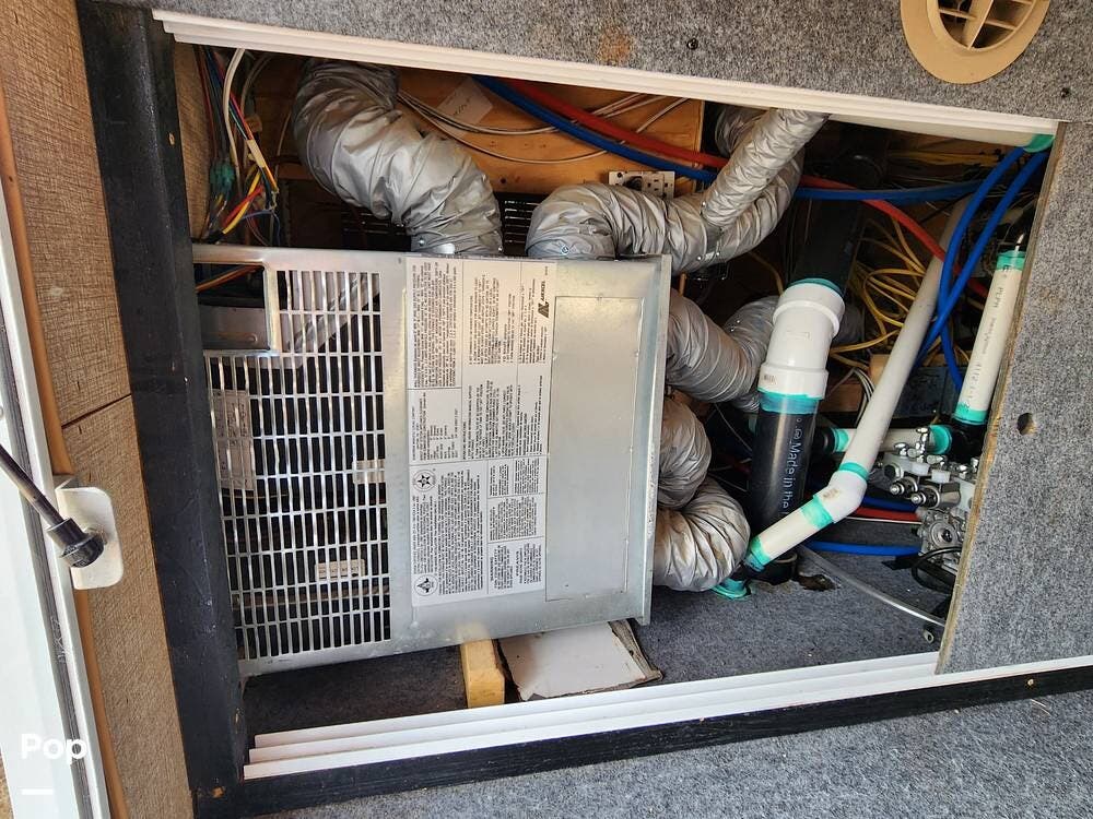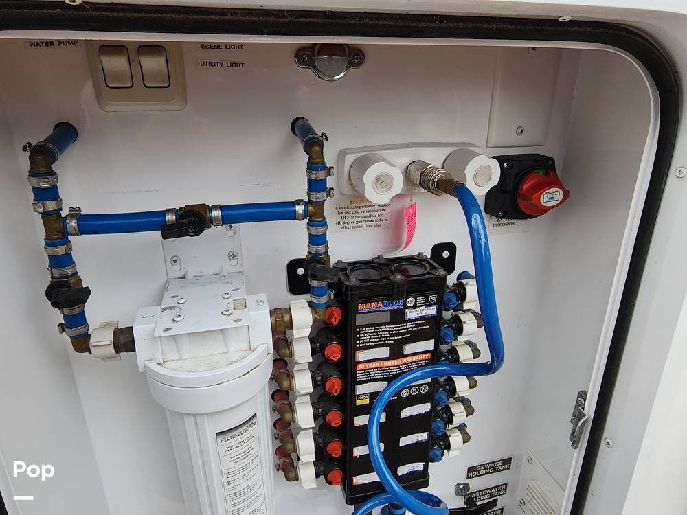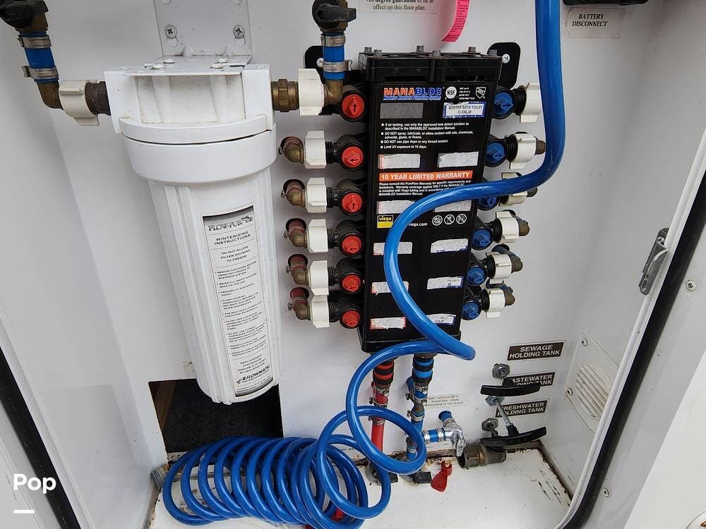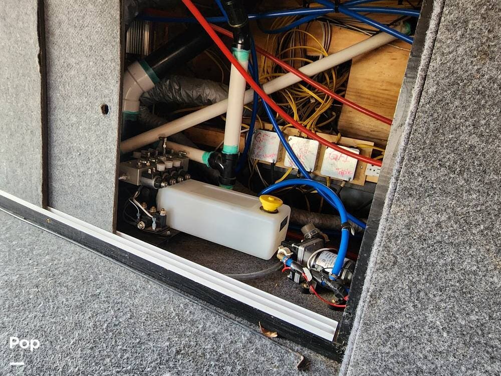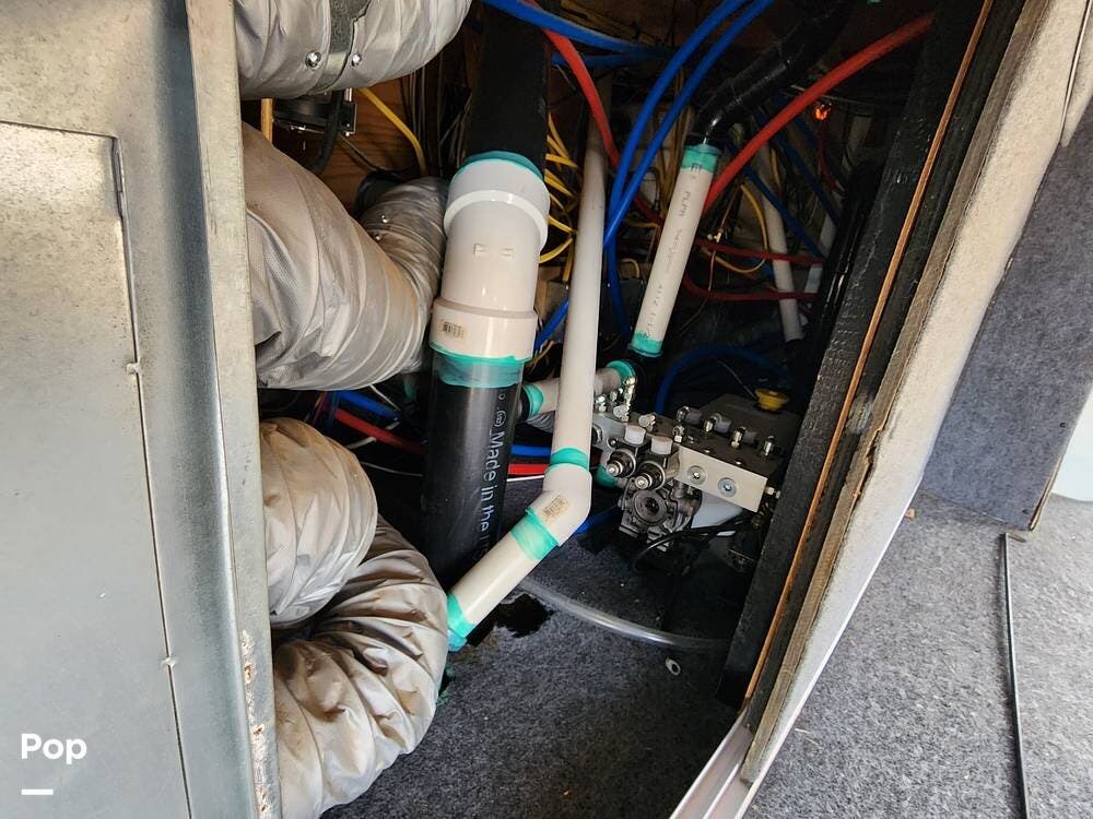 Among the things I really like are the sliding doors in the exterior pass through storage that allow easy access to important systems like the water pump, hydraulics, etc. There are hinged floor panels on either side of the pass through for easy access to the house batteries and to the hydraulic control system. This also opens storage in the front compartment where the bulky batteries are often installed.