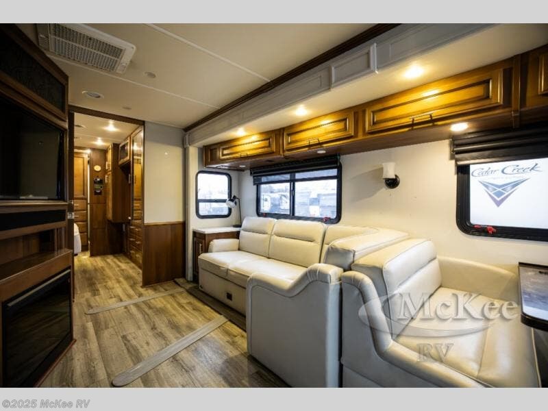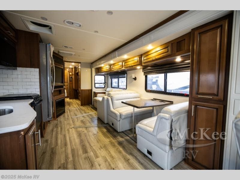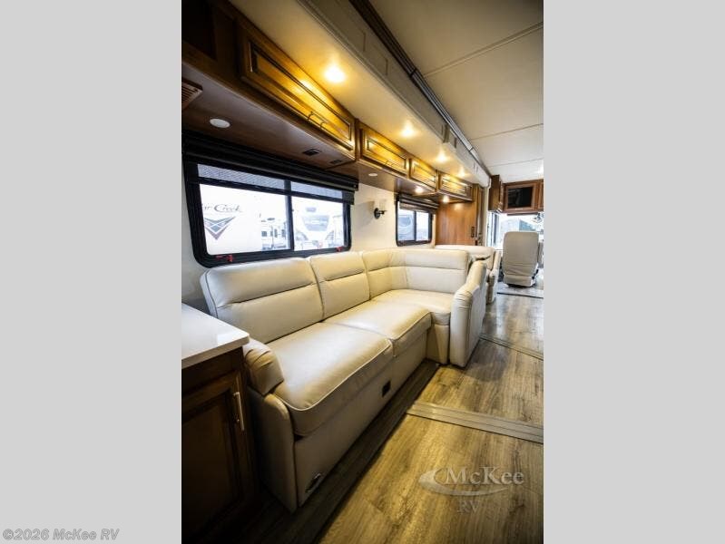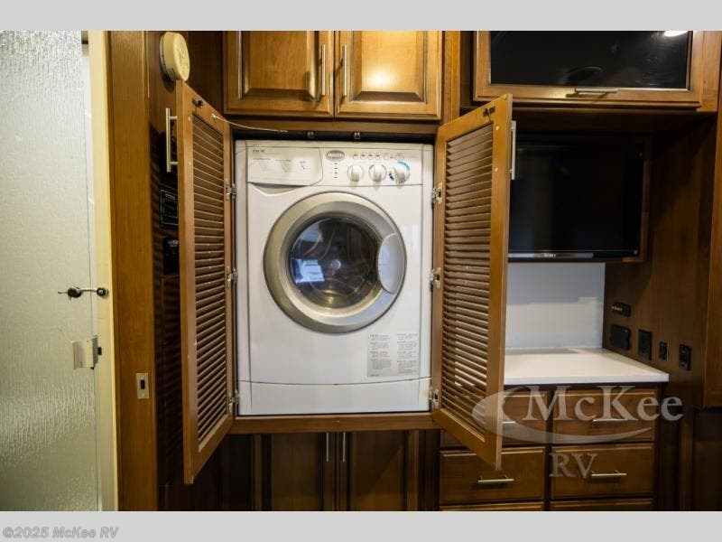 There is plenty of storage with all of the overhead cabinets in this motor home. You also have many options available to you such as, a front 32" LCD tv, exterior entertainment center, three burner range with oven, washer and dryer, fireplace, facing dinette, free-standing dinette with credenza.