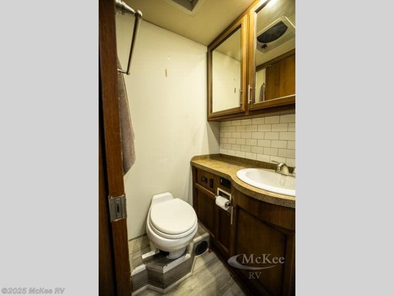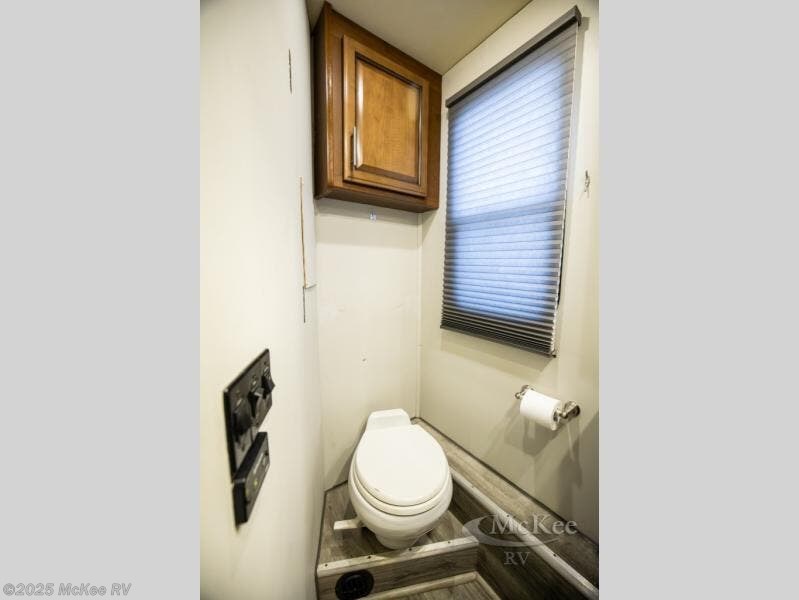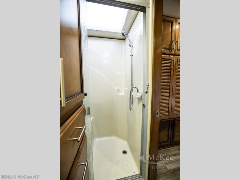 The Bounder 35K Fleetwood motor home features a rear master bathroom as well as convenient half bath. In the rear of the motor home, you will find a toilet, medicine cabinet, sink, linen cabinet, and shower. The bedroom offers a queen size bed and nightstands slide, double wardrobes, a dresser, and a 32" LED tv. As you leave the bedroom, a half bath is located to the right.