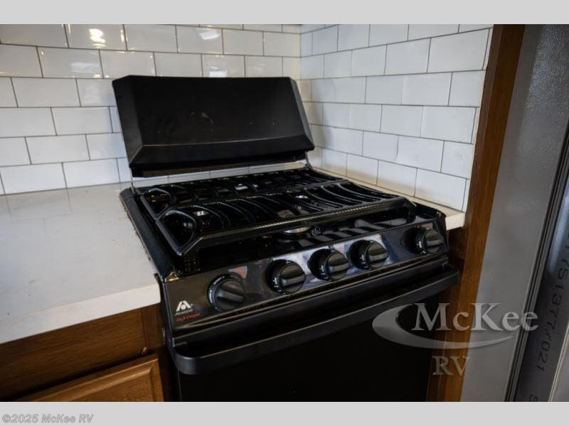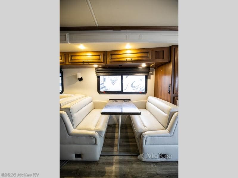 The kitchen and dining areas are combined and offer a 40" LED tv, which can easily be viewed from anywhere in the front of the motor home. One side of the motor home has a refrigerator, three burner range, microwave, and double kitchen sink. The opposite side features a slide with a pantry, dinette, l-sofa, and cabinet.