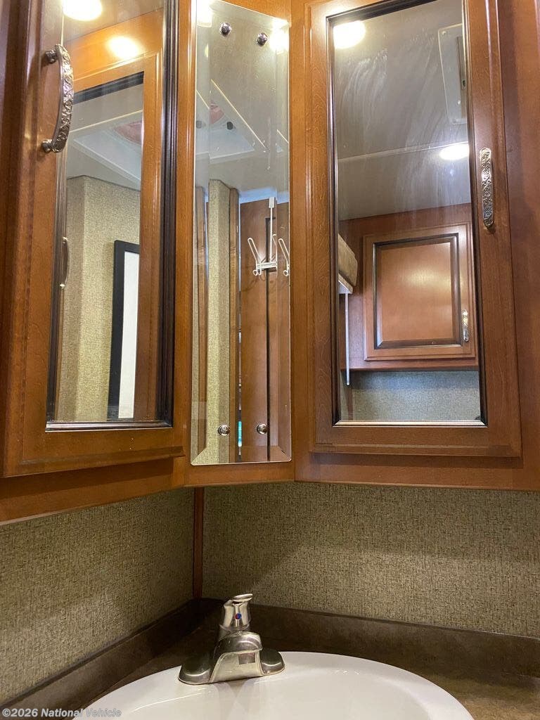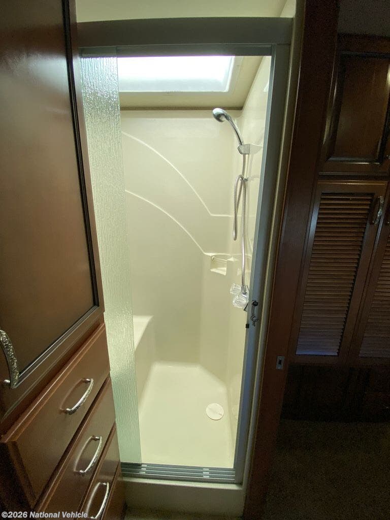 This coach features a bathroom complete with shower, toilet, and a sink with a medicine cabinet above for your convenience.