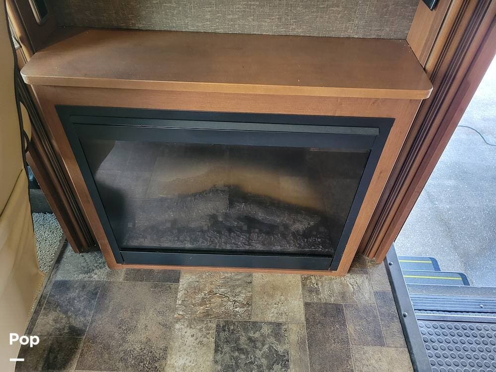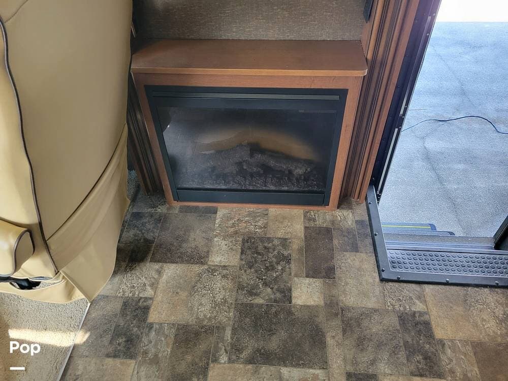 The living area features a large slide, allowing plenty of room for the sleeper sofa and the booth-style dinette sleeper. There is also an electric fireplace and a large flat-screen TV.