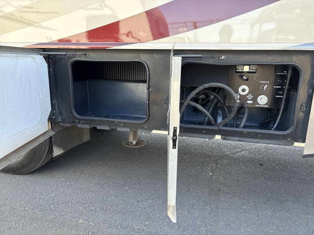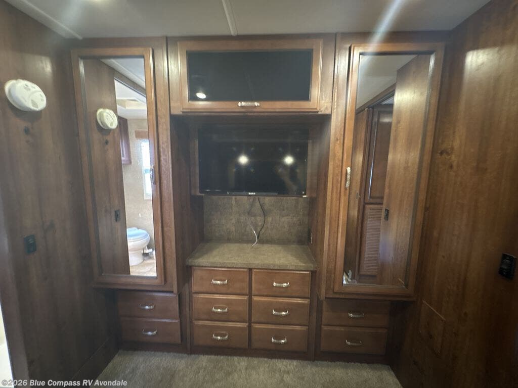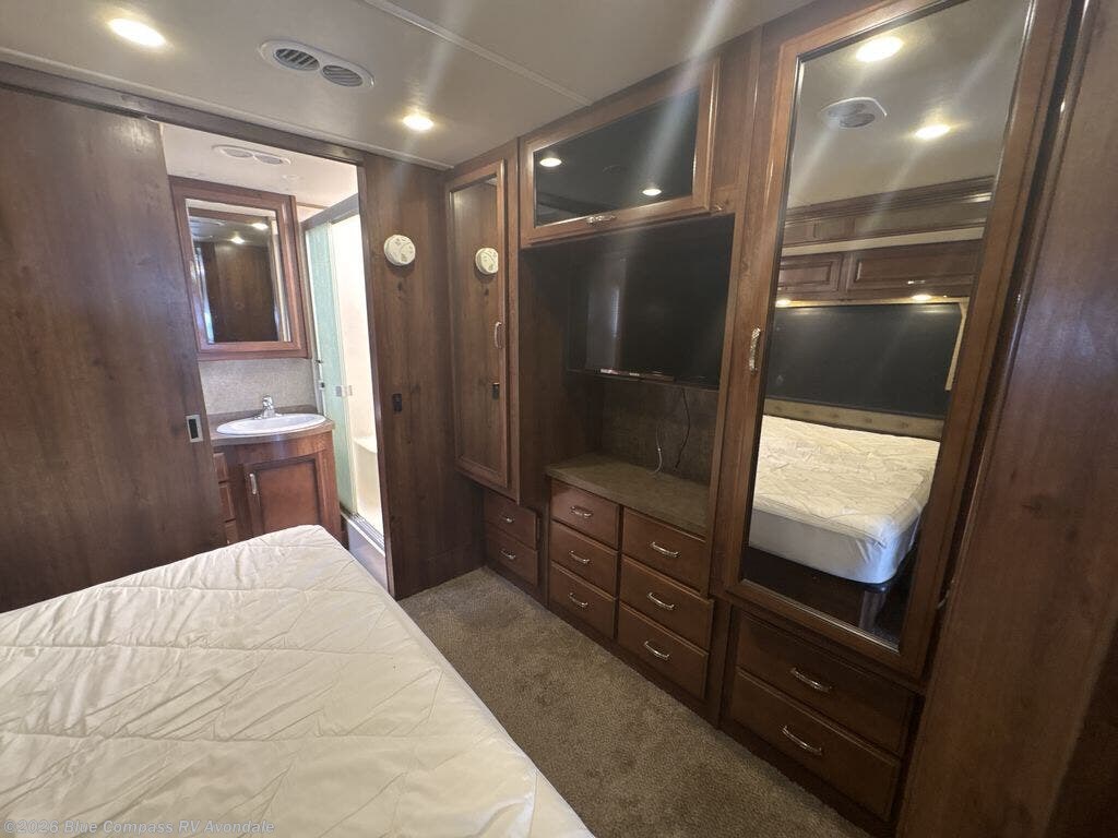 The 36E Bounder Fleetwood motor home features a rear master bathroom as well as a convenient half bath. Starting in the rear of the motor home, you will find the master bath with a cabinet shelf for organization, toilet, sink, and shower. The bedroom has a queen bed and nightstands slide, double wardrobes, dresser, and 32" LED tv. As you leave the bedroom the half bath is on the left.