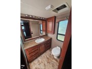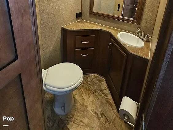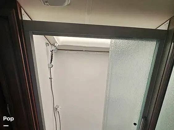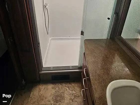 Step into the rear master bath, where you'll find ample cabinet space, a toilet with a macerator, a sink, and one of the largest showers available in an RV.