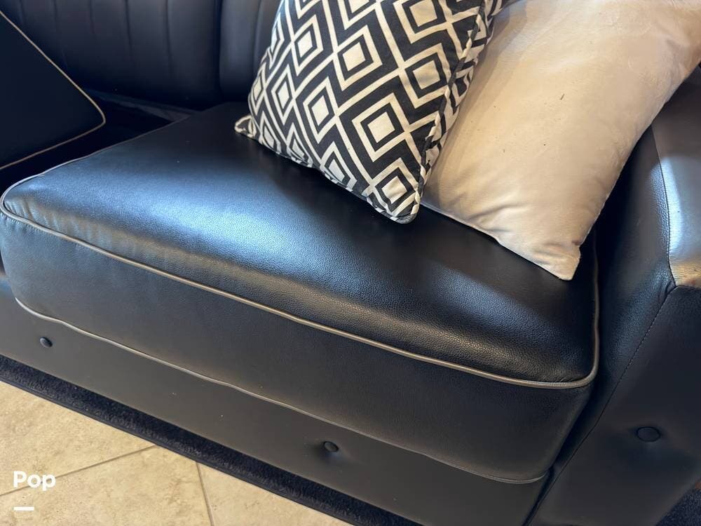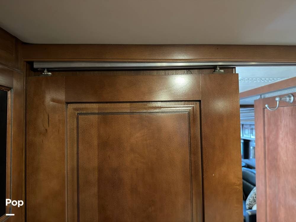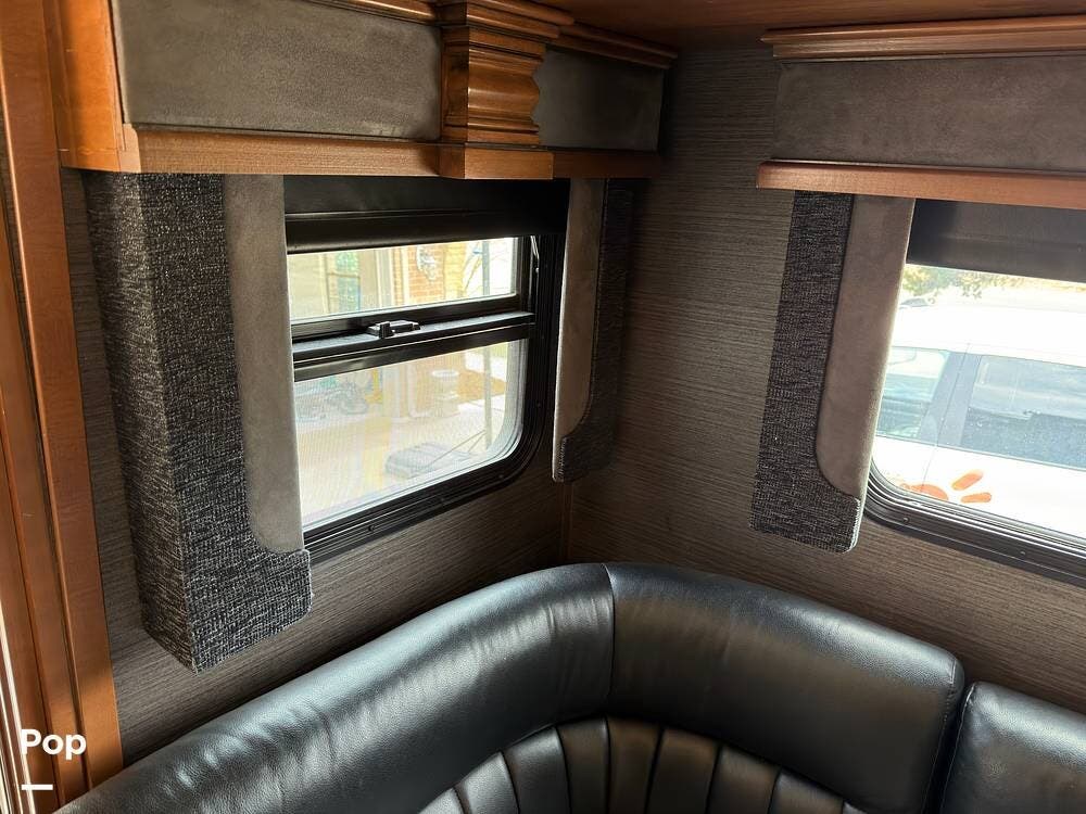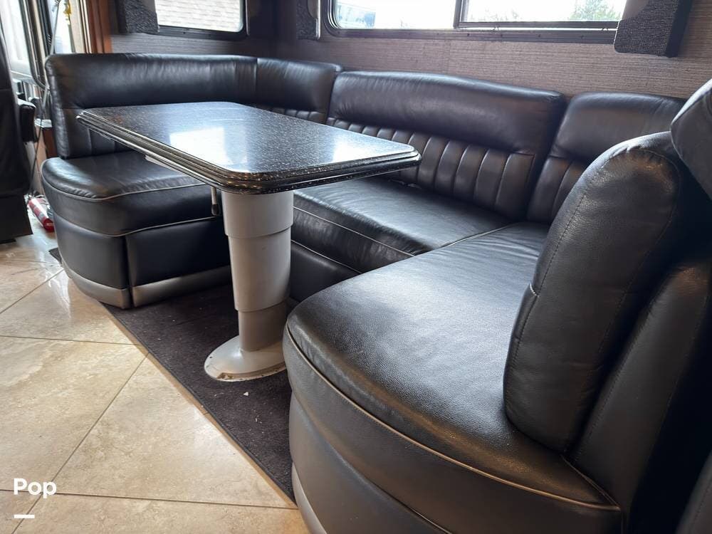 When you walk into this coach, you're greeted with rich hardwood and quality upholstery and fabrics, including opposing sofas next to a dinette sleeper. This area also includes a forward entertainment center with surround sound and TV.