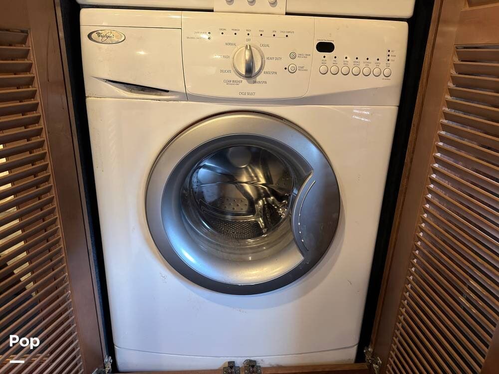 The mid-bath layout is adjacent to the bunks and features a sink, medicine cabinet, garden shower, and toilet. Towards the rear, a king walk-around bed is fronted by a tall dresser, a TV, a large wardrobe, and a stackable washer and dryer.