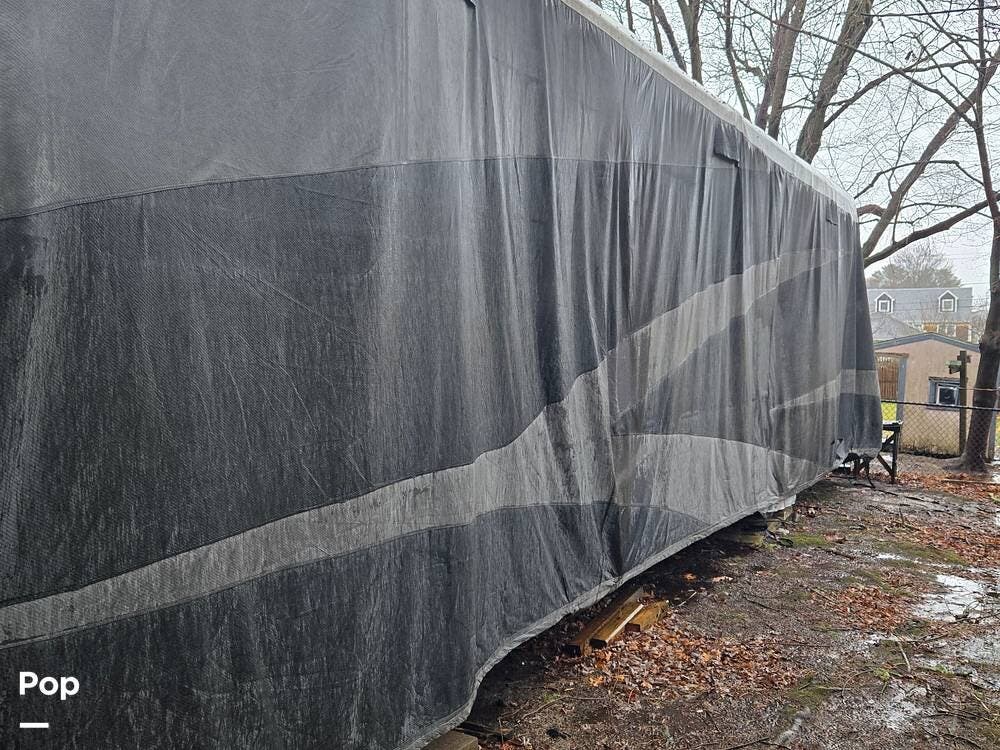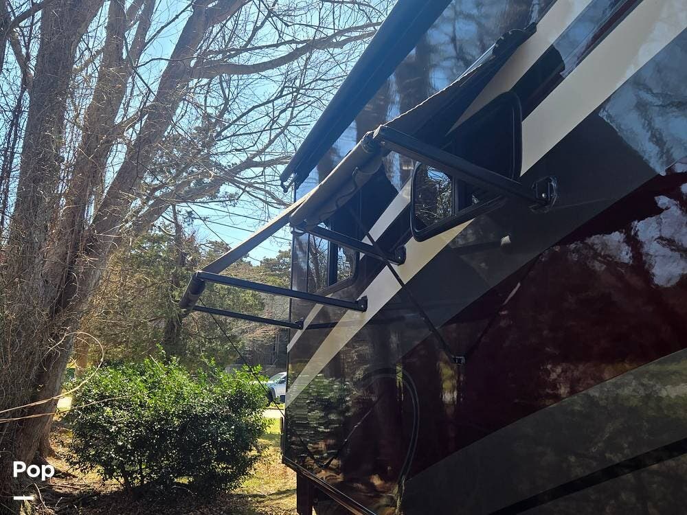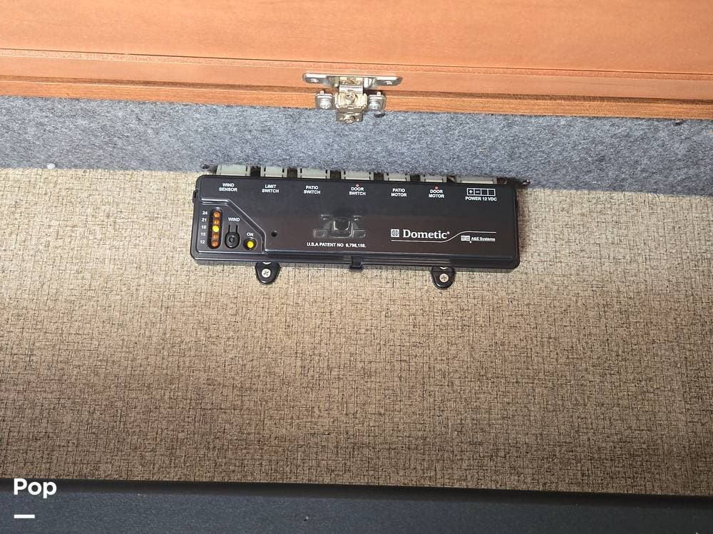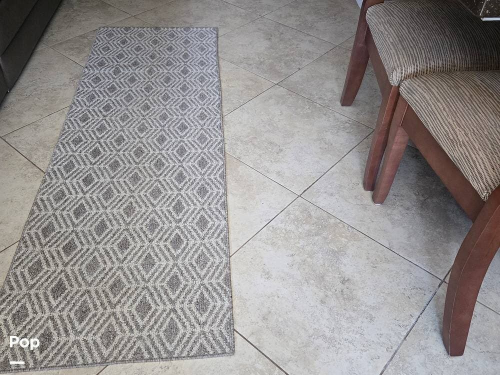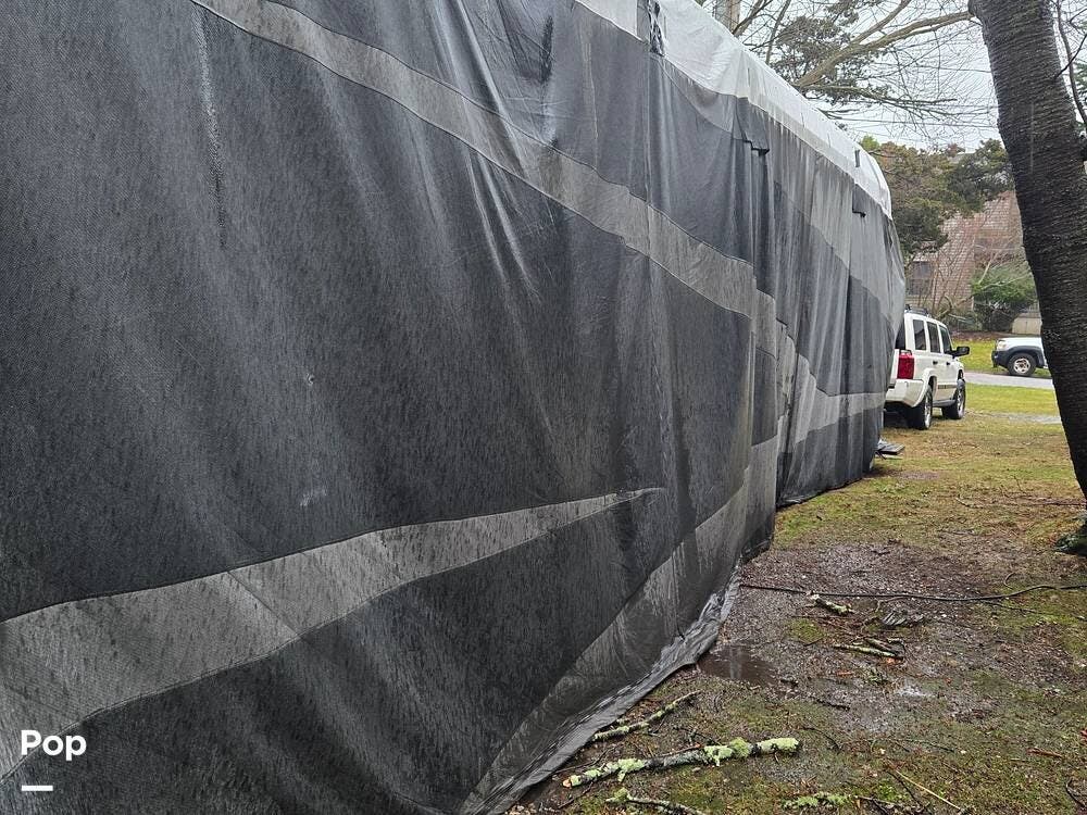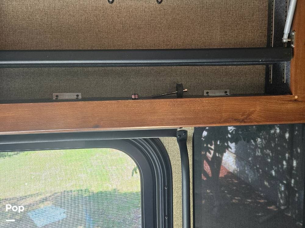 Complementing its sleek fiberglass roof, the exterior includes awnings over all slides, windows, and the entry door, ensuring shade and protection wherever you roam.
