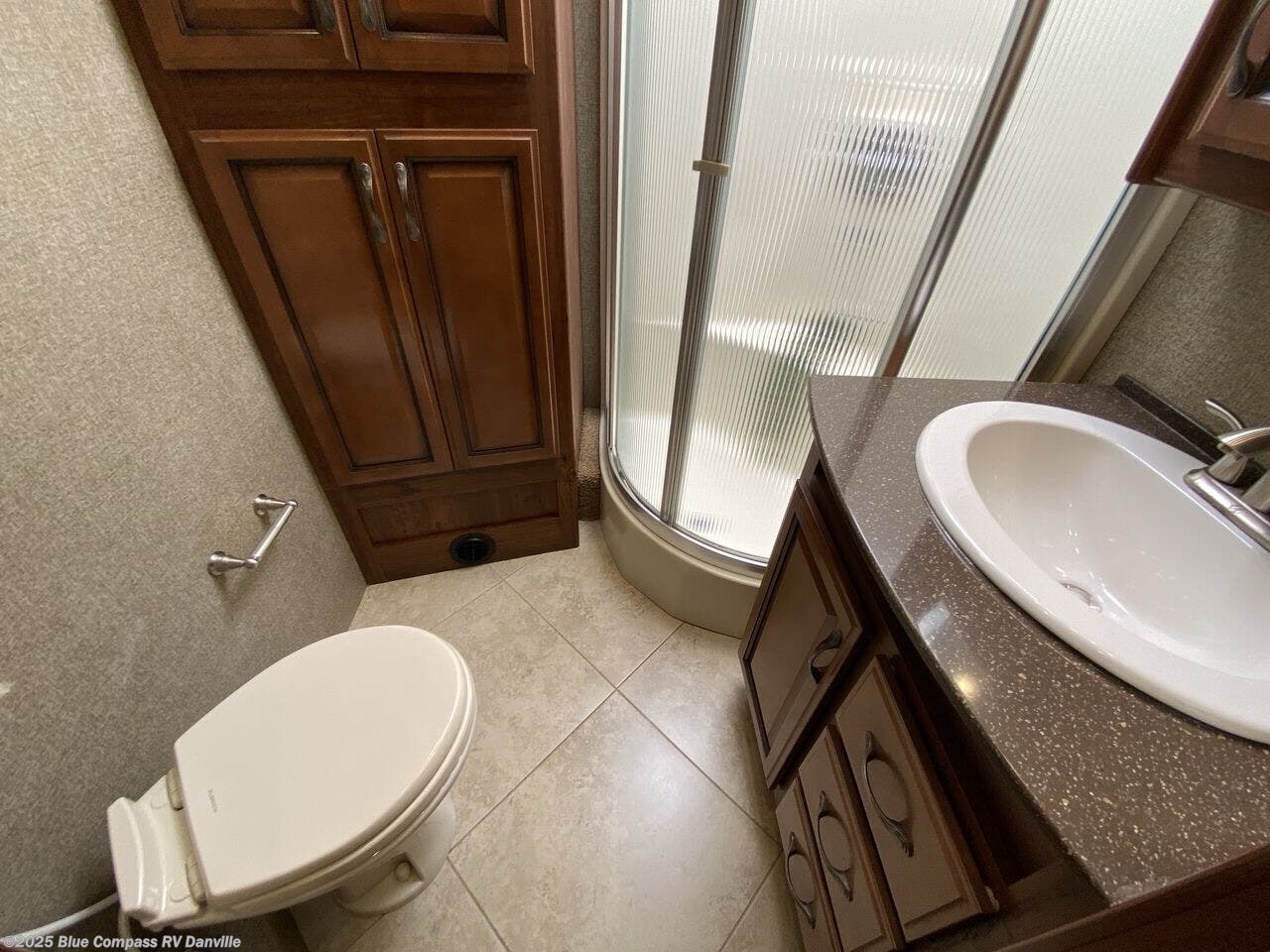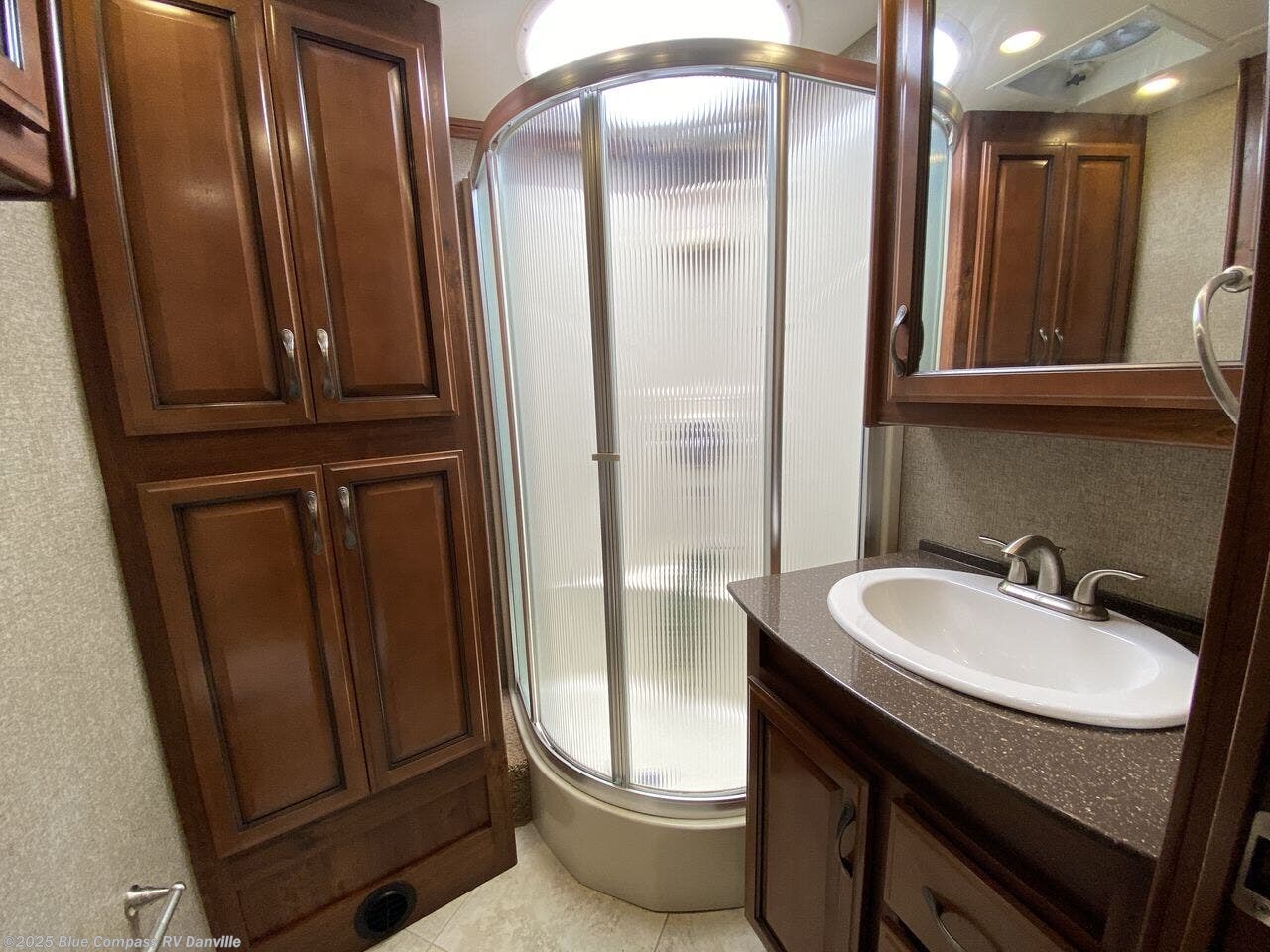 Proceeding toward the rear of the motor home, you will come to a bathroom. Inside you will find a sink, linen cabinet, corner angle shower, and toilet.