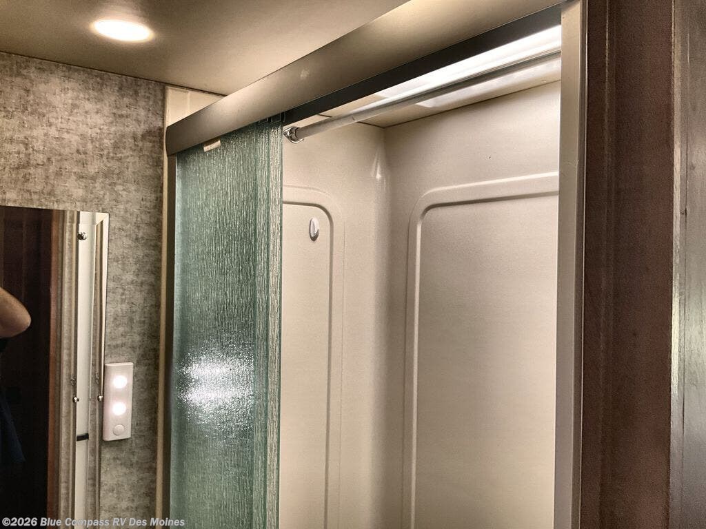 As you proceed down the hallway toward the rear of the motor home, the side aisle bathroom is on the right. Inside the bathroom you will find a shower, sink, and toilet.