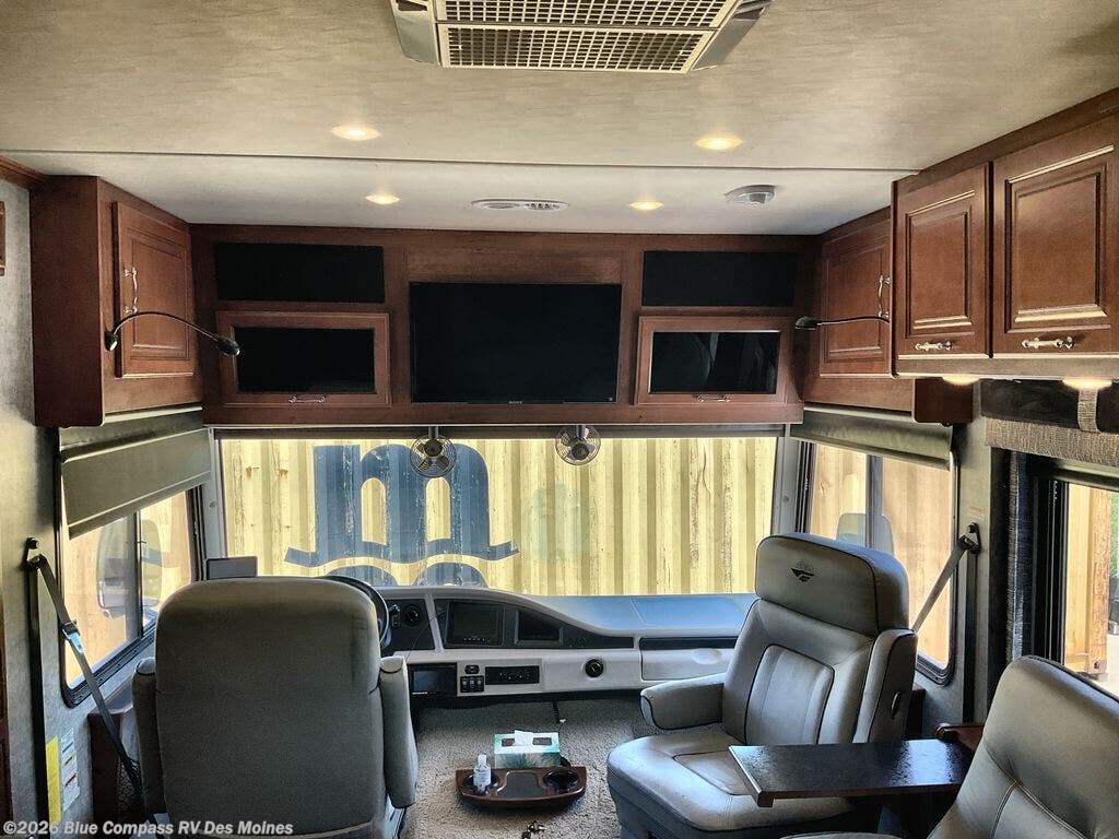 This motor home has plenty of overhead cabinet space for storage. There are also plenty of options to help tailor this motor home for your needs. You can choose a front 32" LED tv, 3 burner range with oven, sofa sleeper with air mattress & footrest, mid-ship 40" LED tv, free standing recliner, facing dinette, free-standing dinette with credenza, and a queen bed with air mattress.