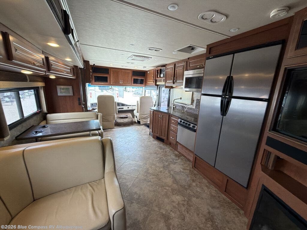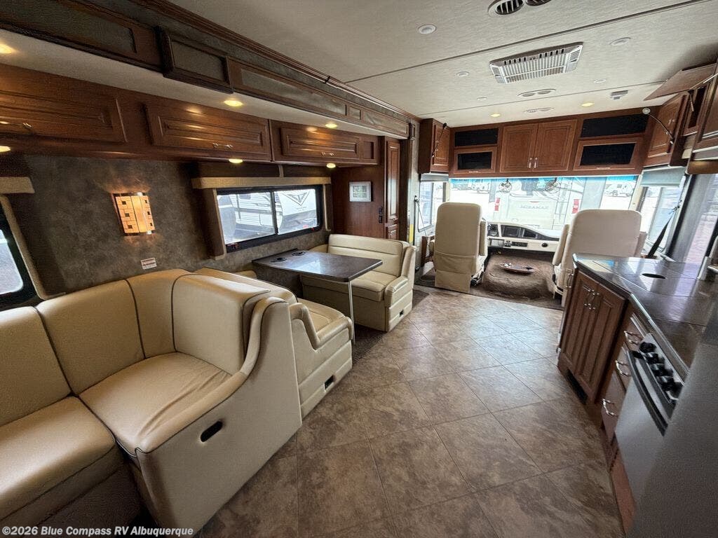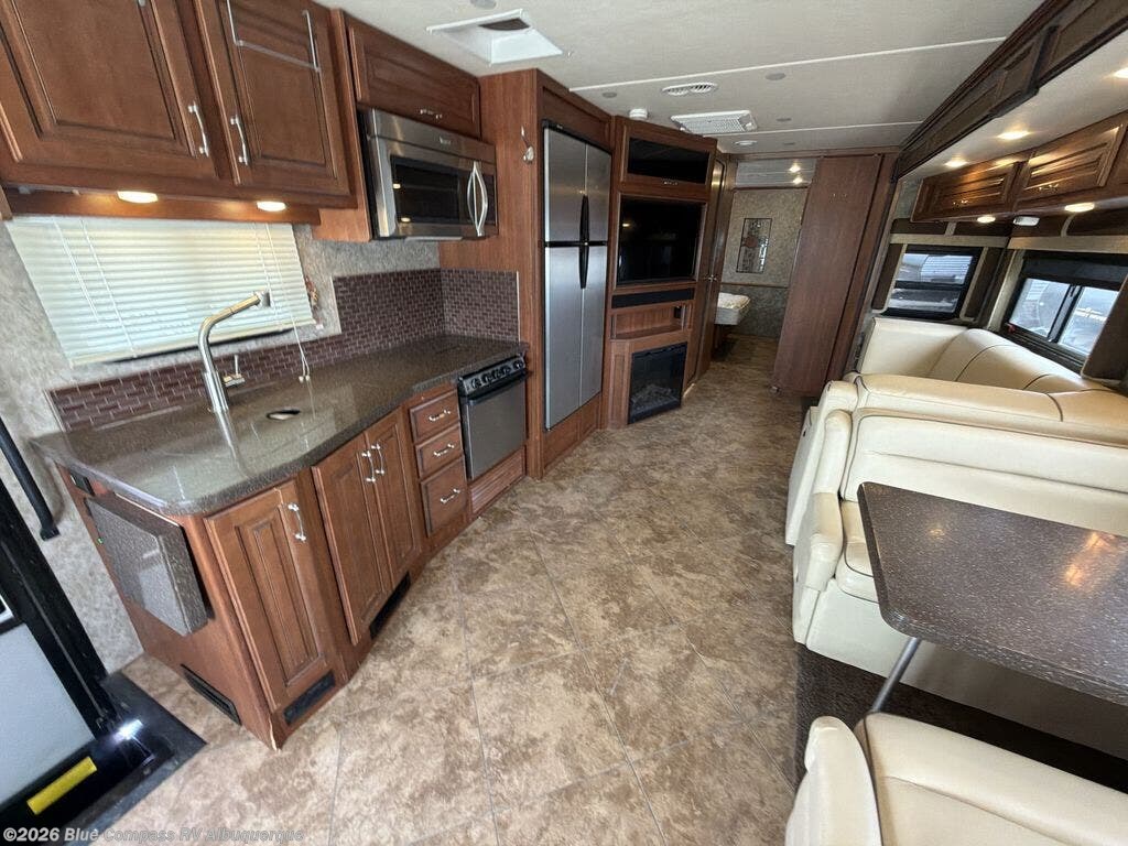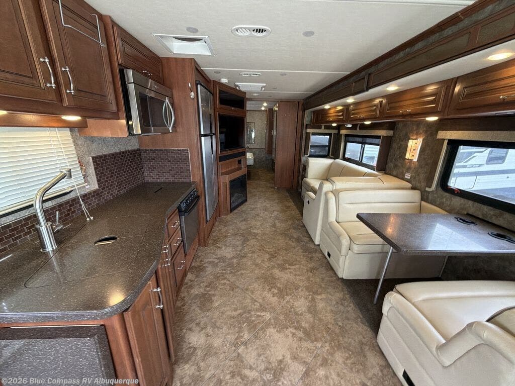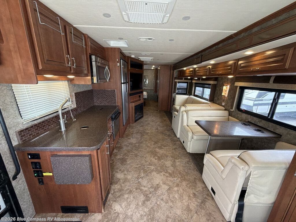 This motor home is not lacking for storage space with all of the overhead cabinets. You can choose many options to make the motor home more of your own, such as a front 32" LED tv, exterior entertainment center, three burner range with oven, washer & dryer, electric fireplace, facing dinette, free-standing dinette with credenza, king bed, queen bed with air mattress and much more!
