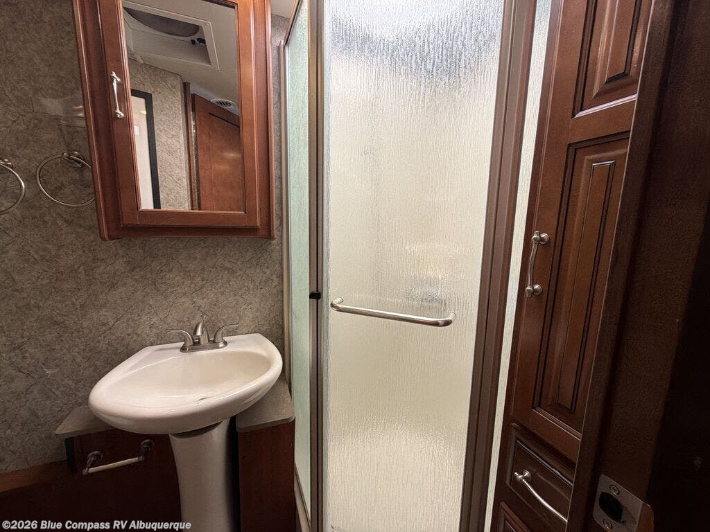 The side aisle bathroom is on the left as you proceed to the rear of the motor home. In the bathroom you will find a linen cabinet, corner angle shower, sink, and toilet.