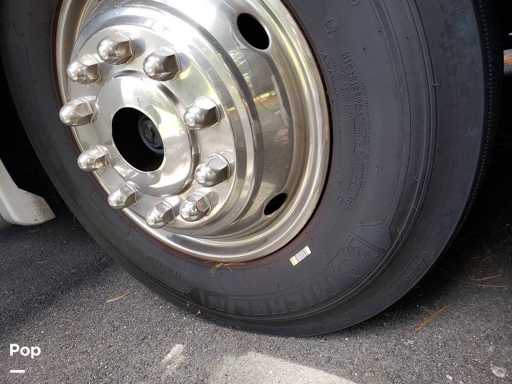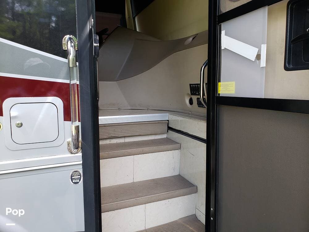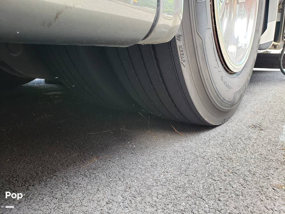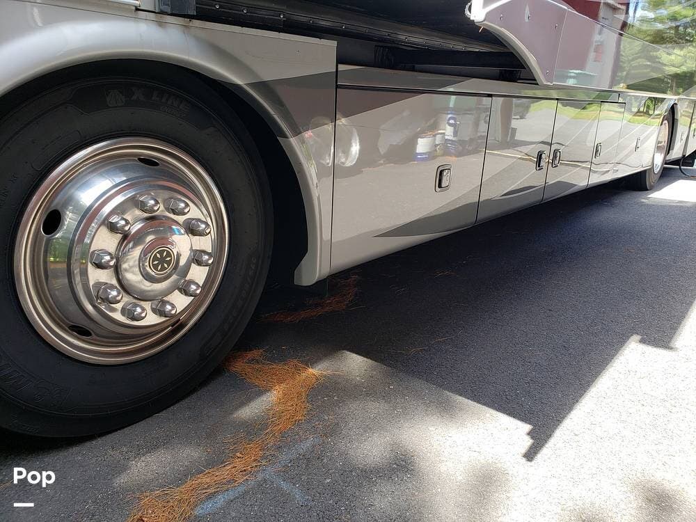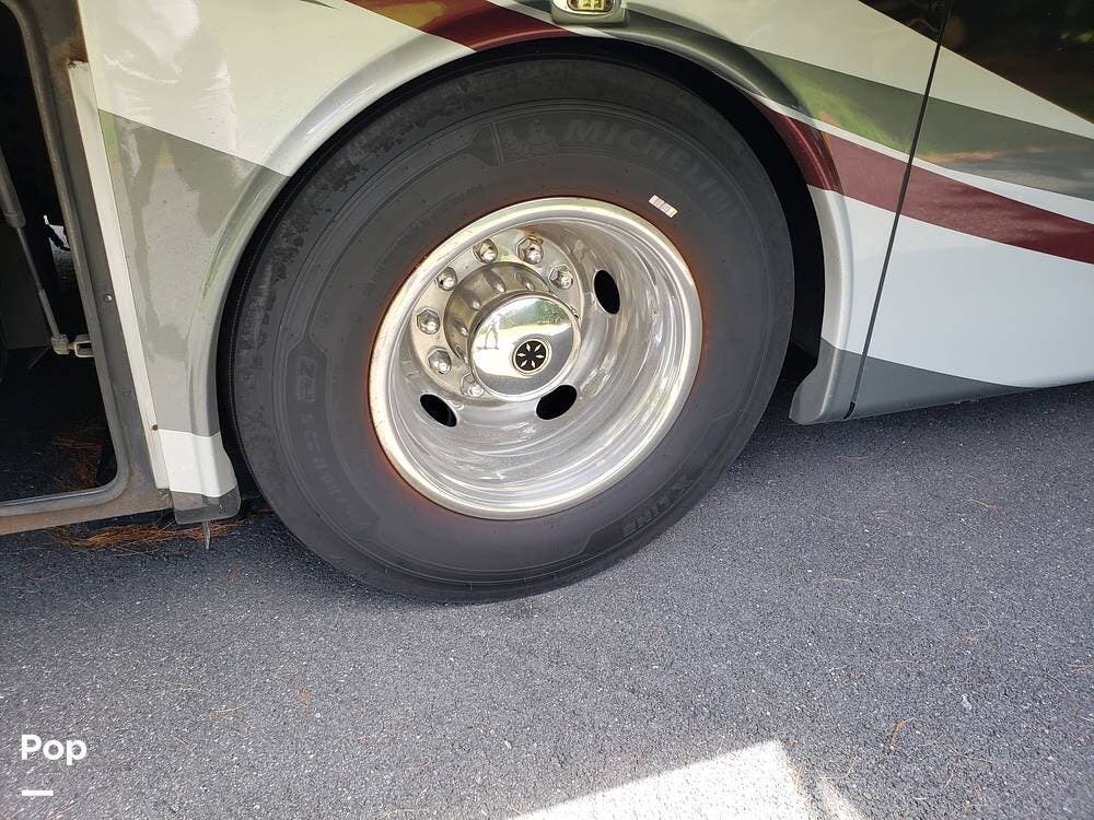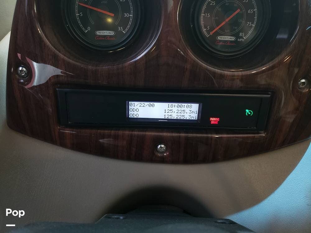 This Berkshire sits on a raised rail XC-Series Freightliner chassis and includes an 8.0kW Onan quiet diesel generator with slide-out, tinted dual pane glass, ceramic tile flooring forward of the bedroom, aluminum wheels, and a 10,000 lb. hitch.