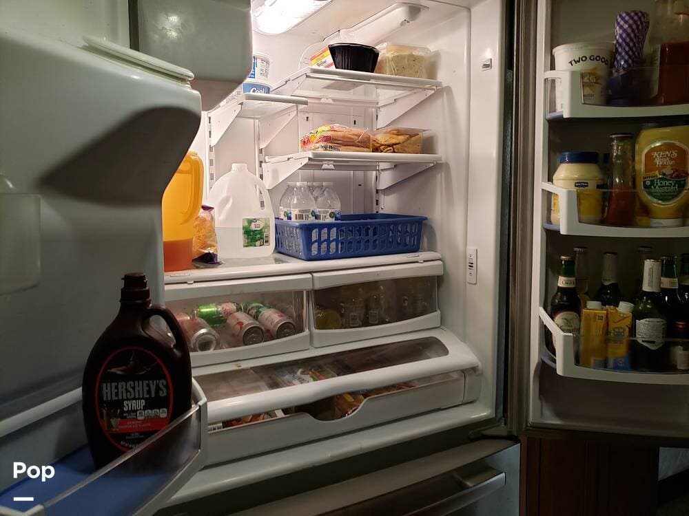 The main living area has a full kitchen with a full-size refrigerator/freezer. Against the back wall is a 43-inch flat-screen TV.