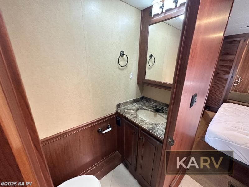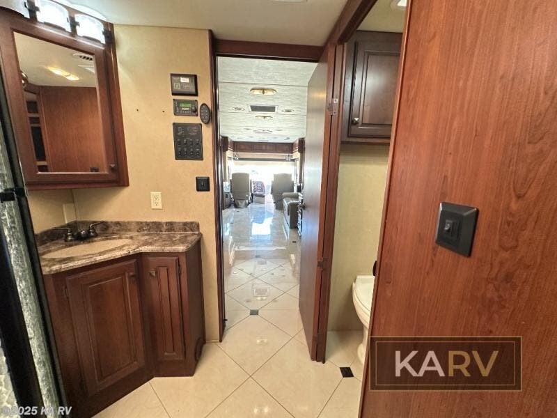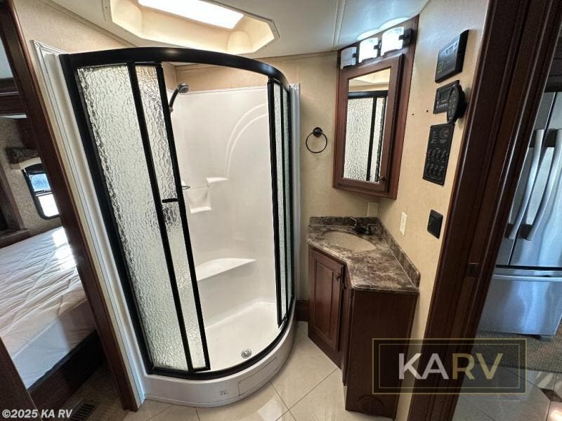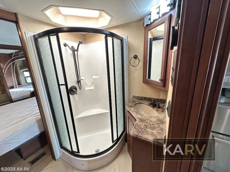 The bathroom is split and has a shower and sink on one side of the motor home and a private toilet area with a sink on the other side.