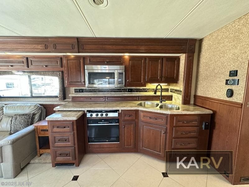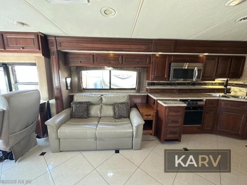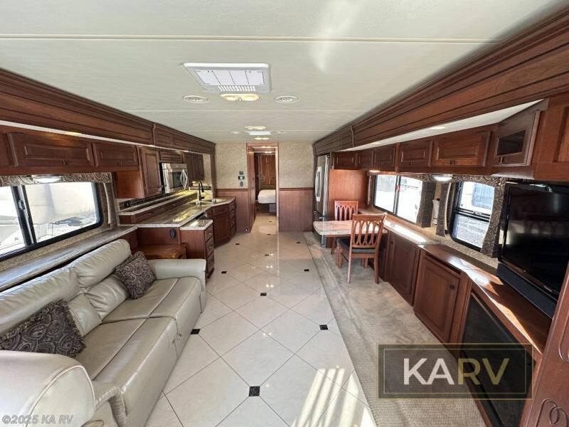 As you enter the motor home, to the left is a slide with an expandable sofa, three burner range, microwave, and double kitchen sink. The other side of the motor home has a lounge chair, corner entertainment center with a 40" LCD TV, booth dinette, and refrigerator.