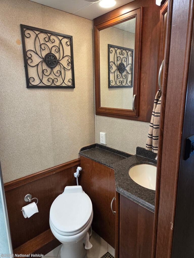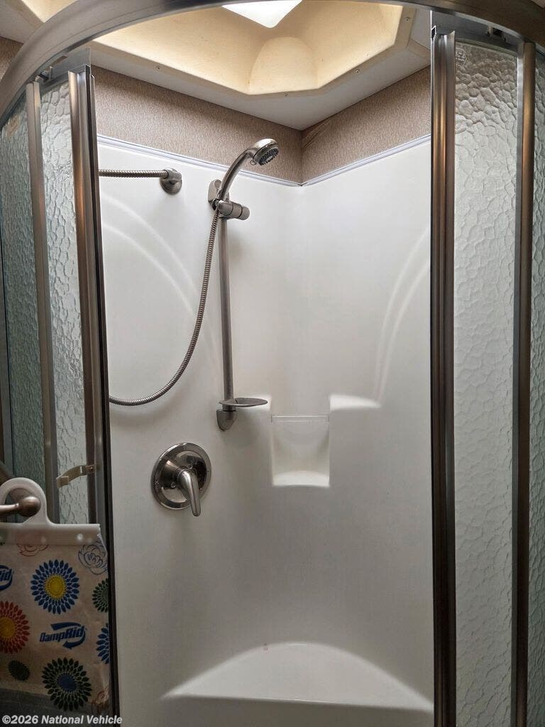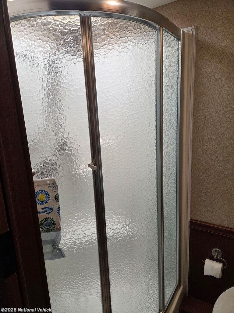 This coach features a bathroom complete with shower, toilet, and a sink with a medicine cabinet above for your convenience.