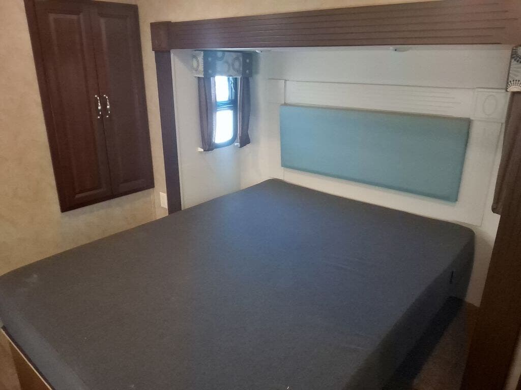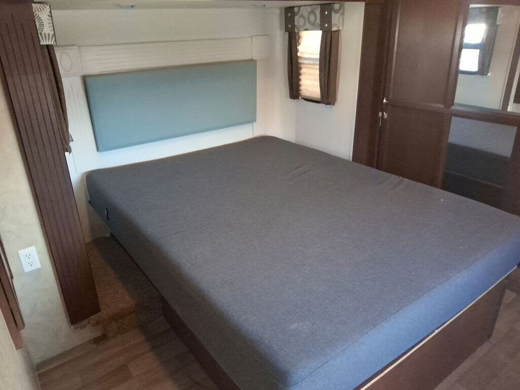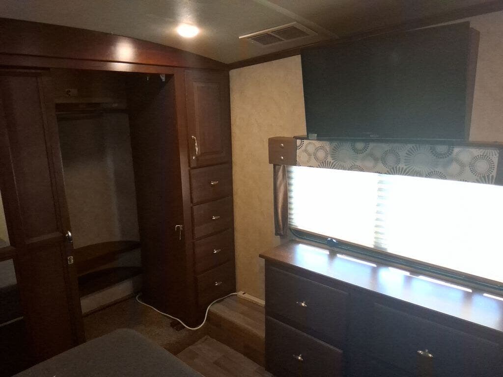 The private bedroom offers a comfortable queen bed slide, a full wardrobe with shelves on one end and drawers on the other as well as a vanity. A king bed is optional and there is washer/dryer prep inside the front wall wardrobe.