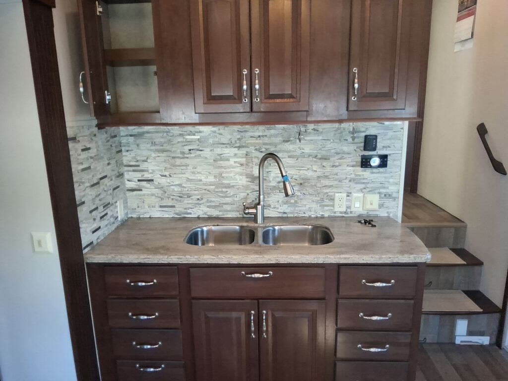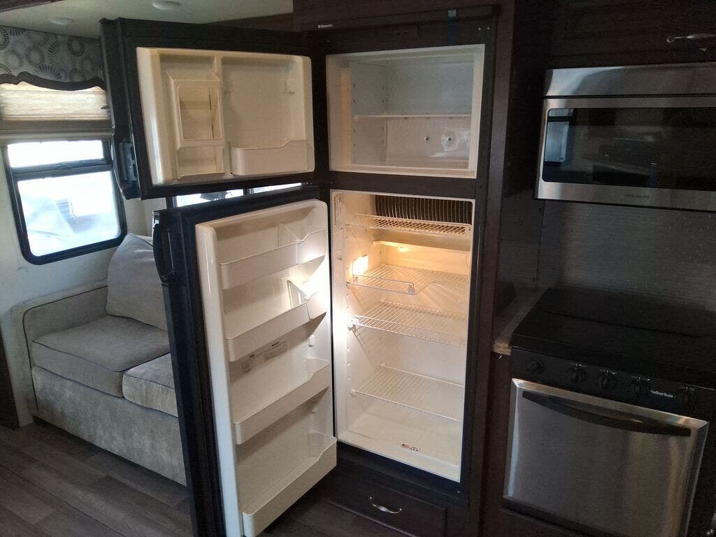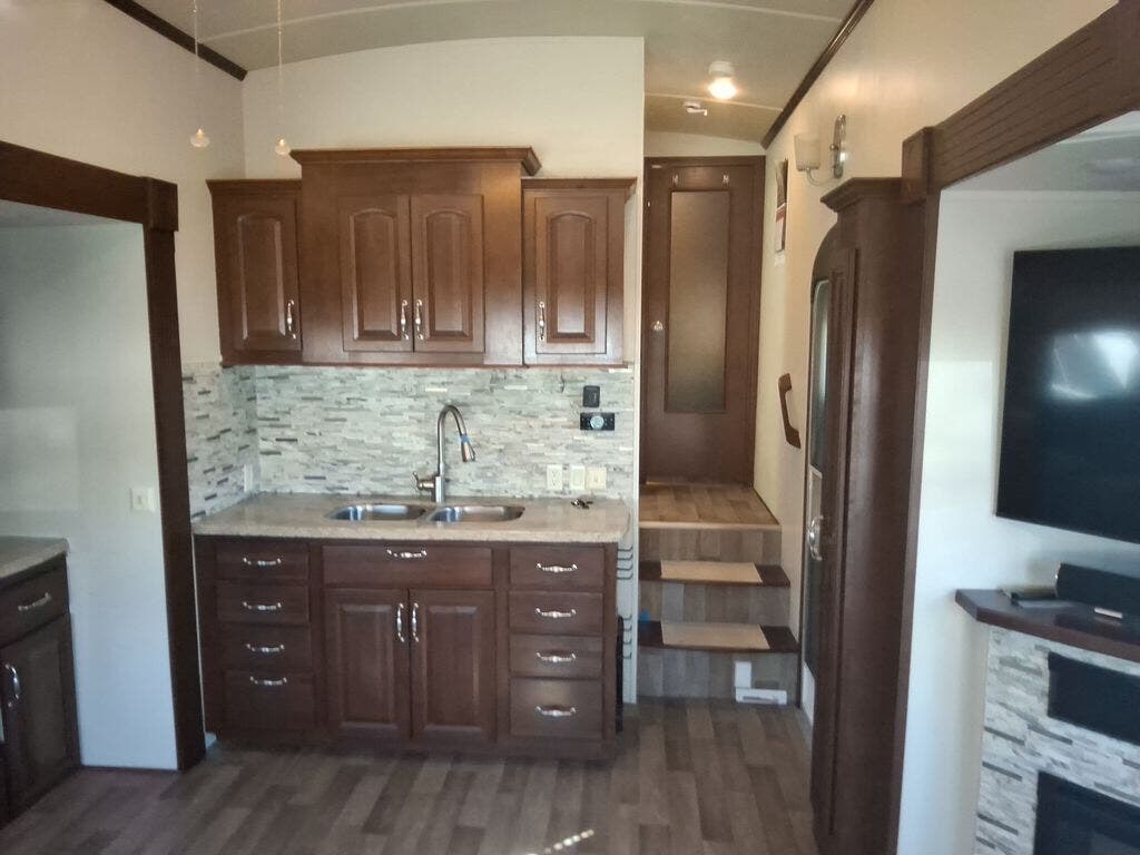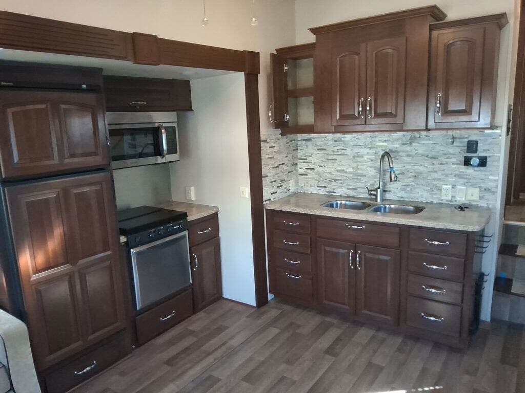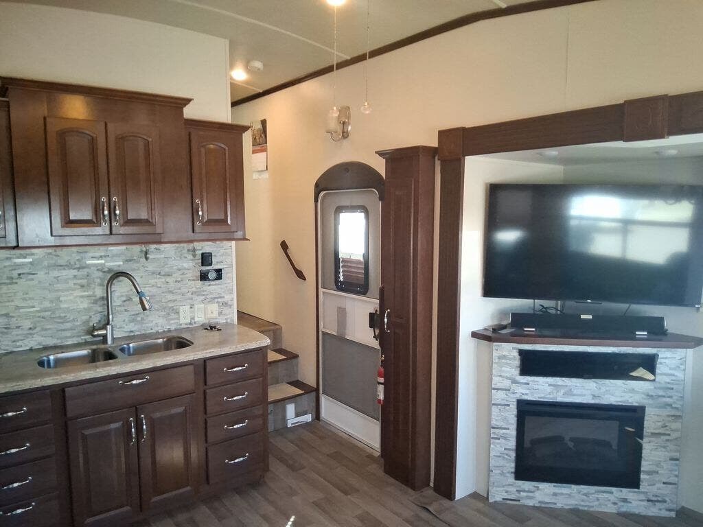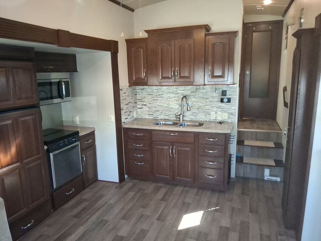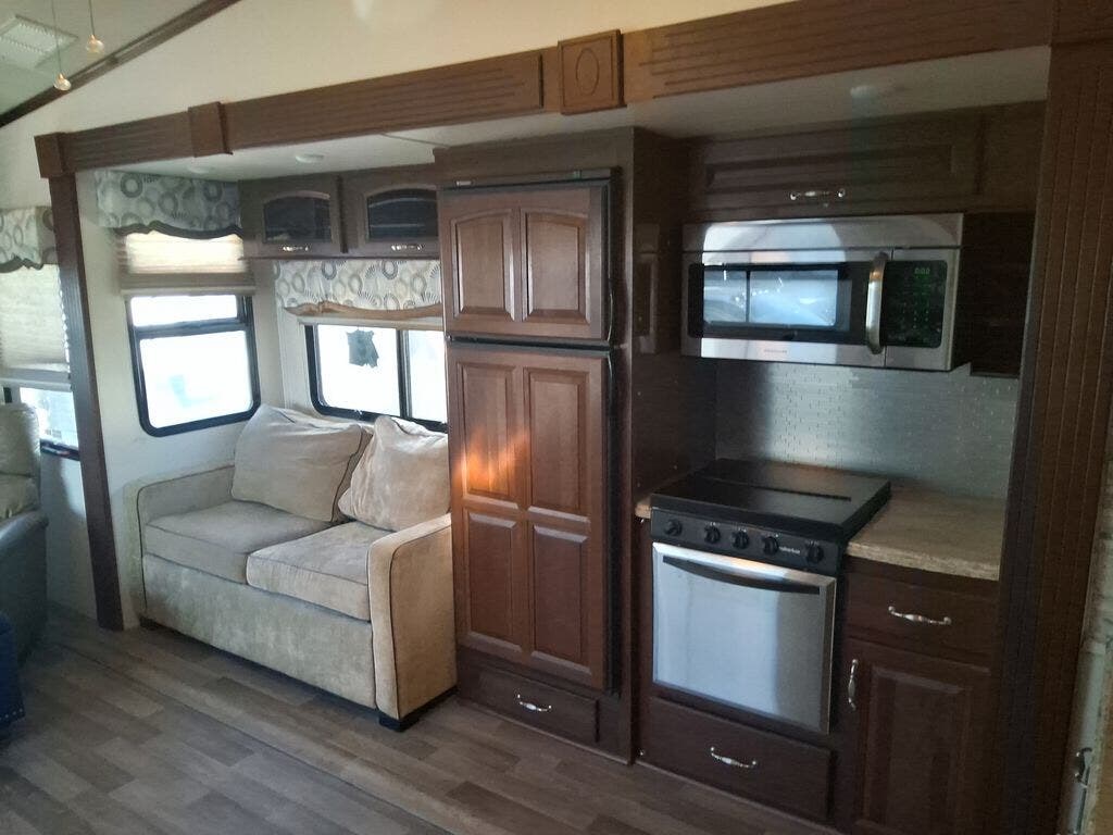 As you enter the fifth wheel, directly in front of you is overhead storage and a closet for an optional washer and dryer. To the left of the entry is a slide with a refrigerator, pantry, three burner range with overhead microwave, fireplace, TV lift and overhead cabinets. Along the rear wall is a sofa with end tables. The other slide offers two lounge chairs, and a free-standing dinette. The kitchen also has a kitchen island with a double kitchen sink and optional dishwasher.