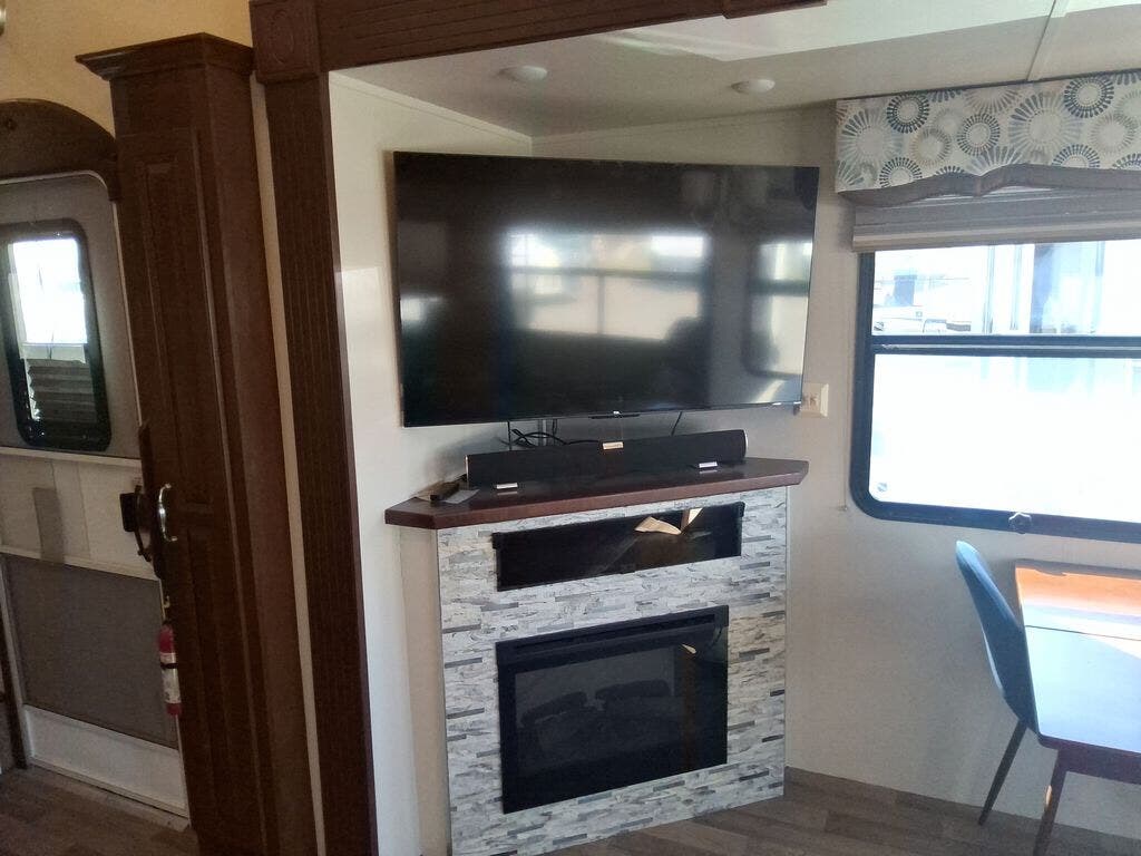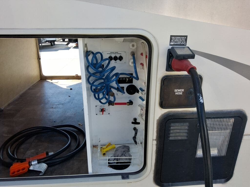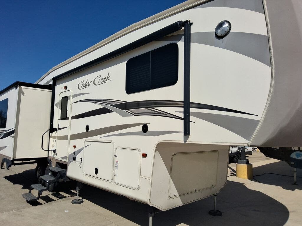 The Cedar Creek 32RL fifth wheel by Forest River offers triple slides and a rear living area.