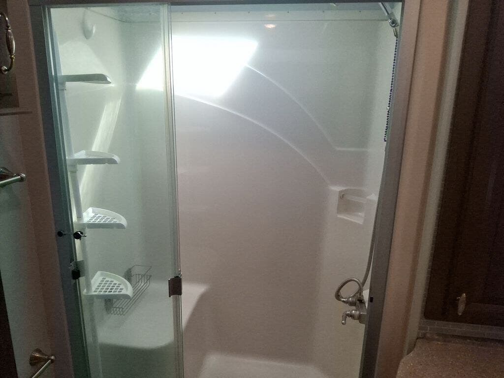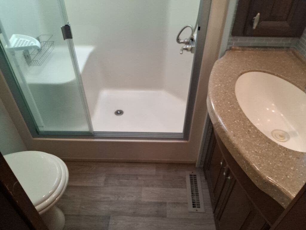 As you step up the stairs, the bathroom is on the left. Inside the bathroom you will find a toilet, vanity sink, overhead cabinet, and residential size shower with seat.