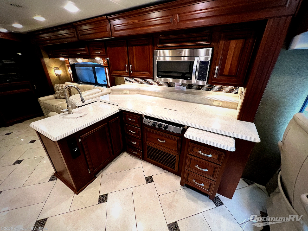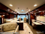 As you enter the motor home, on the left side there is a slide with a refrigerator, table, and lounge chair. The opposite slide offers a set of pullout drawers, three burner range, double kitchen sink, and an extendable sectional sofa slide. Along the rear wall there is a 32" LED TV for you to enjoy.