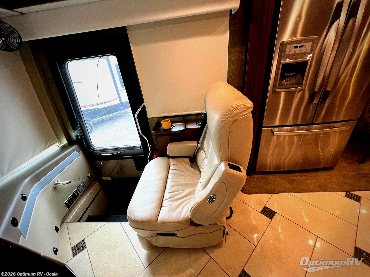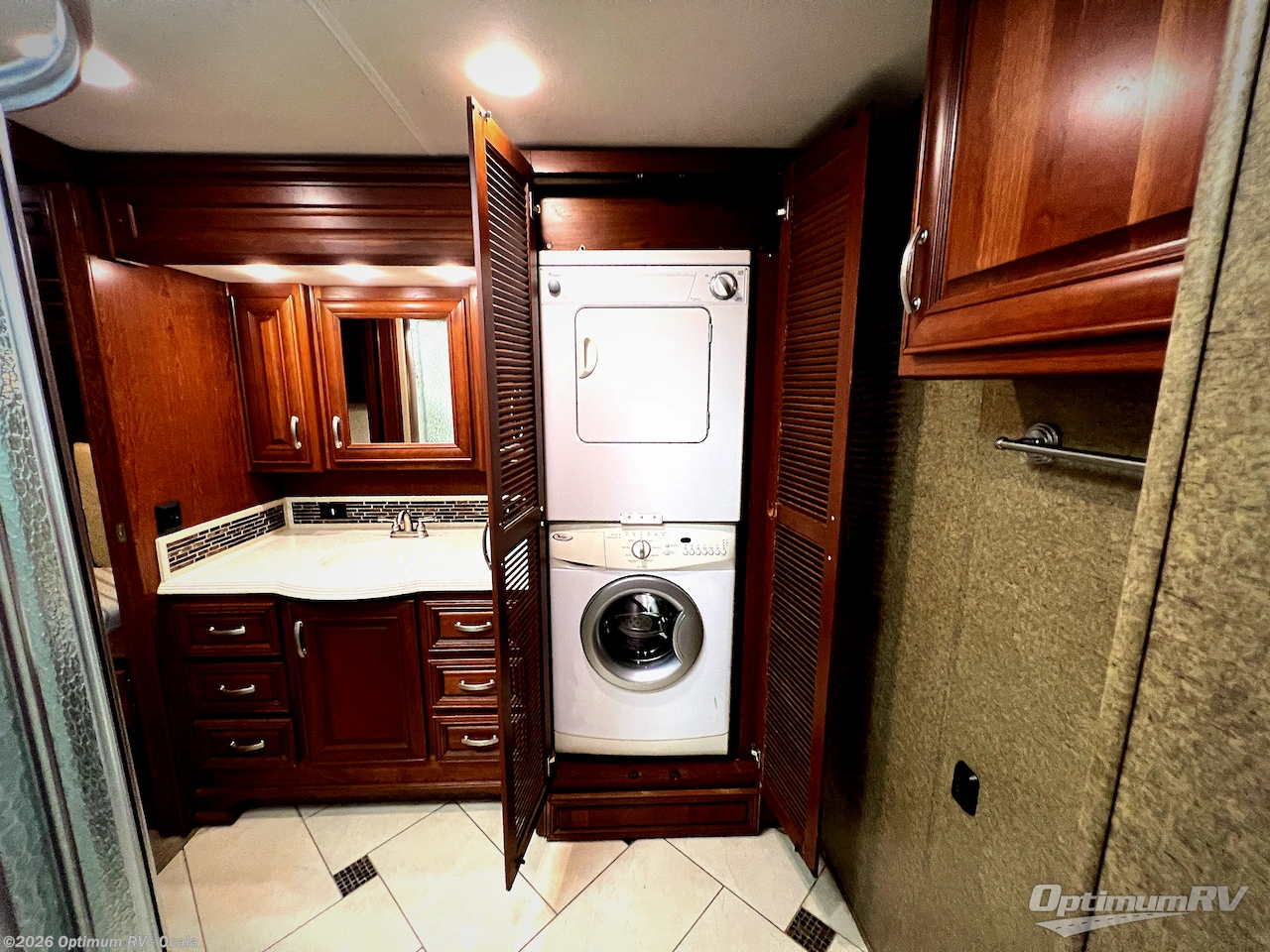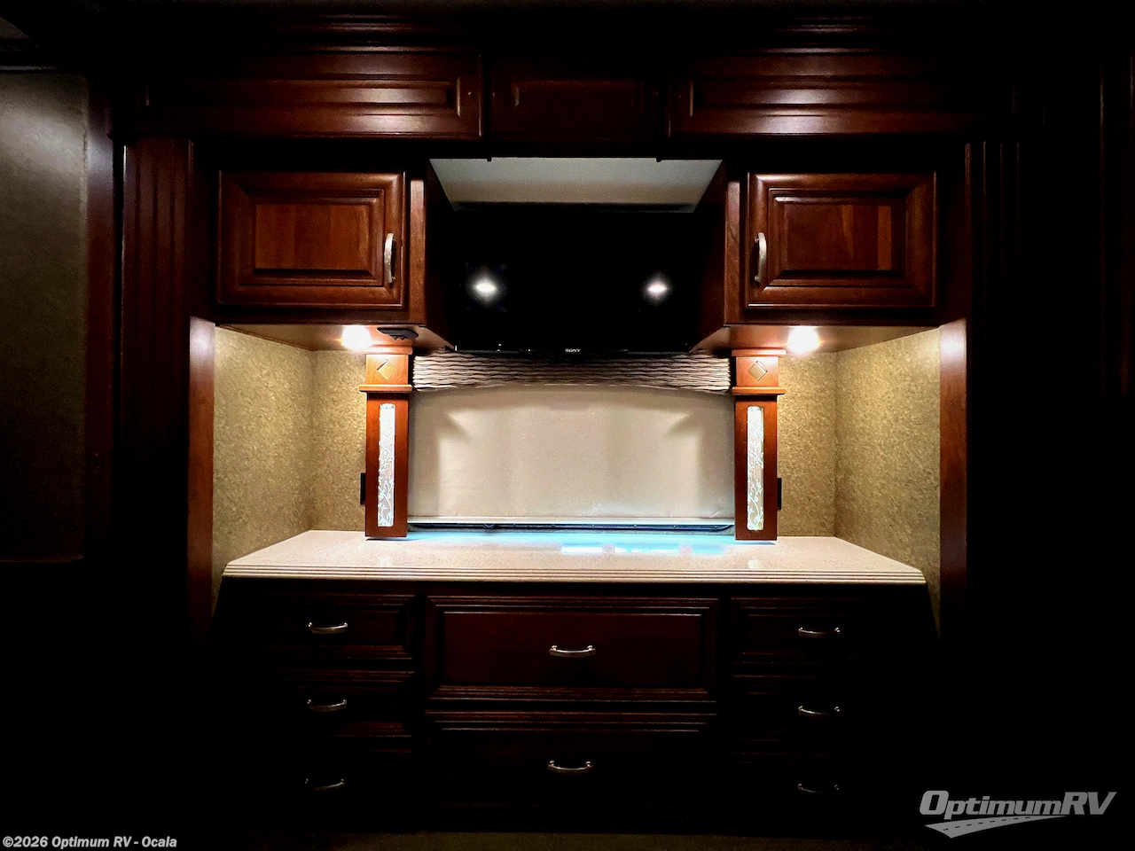 As you enter the motor home, on the left side there is a slide with a refrigerator, table, and lounge chair. The opposite slide offers a set of pullout drawers, three burner range, double kitchen sink, and an extendable sectional sofa slide. Along the rear wall there is a 32" LED TV for you to enjoy.