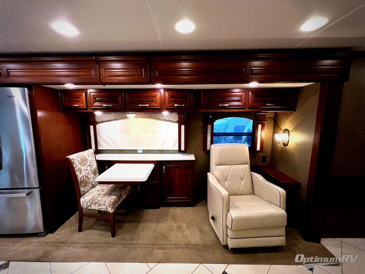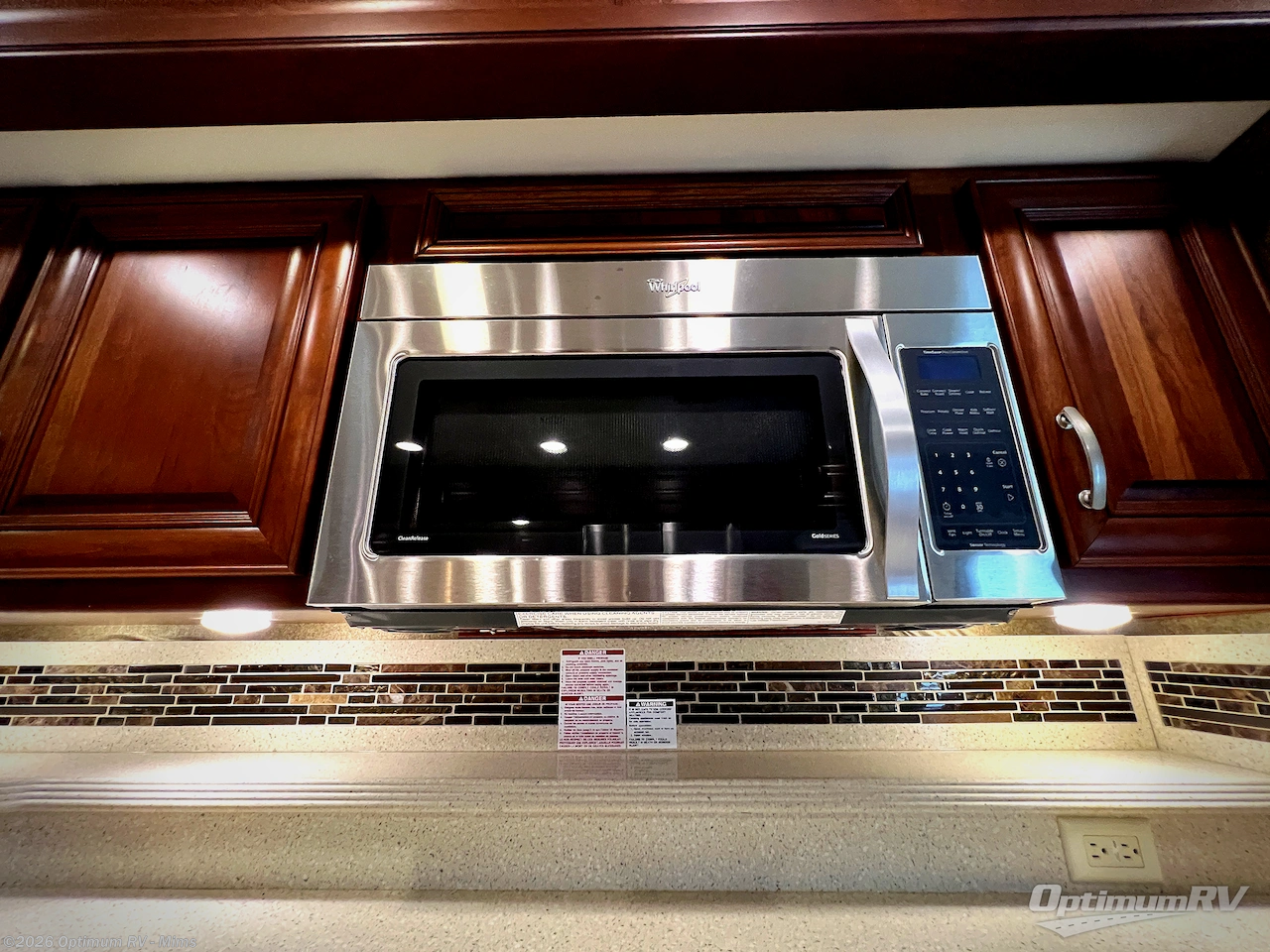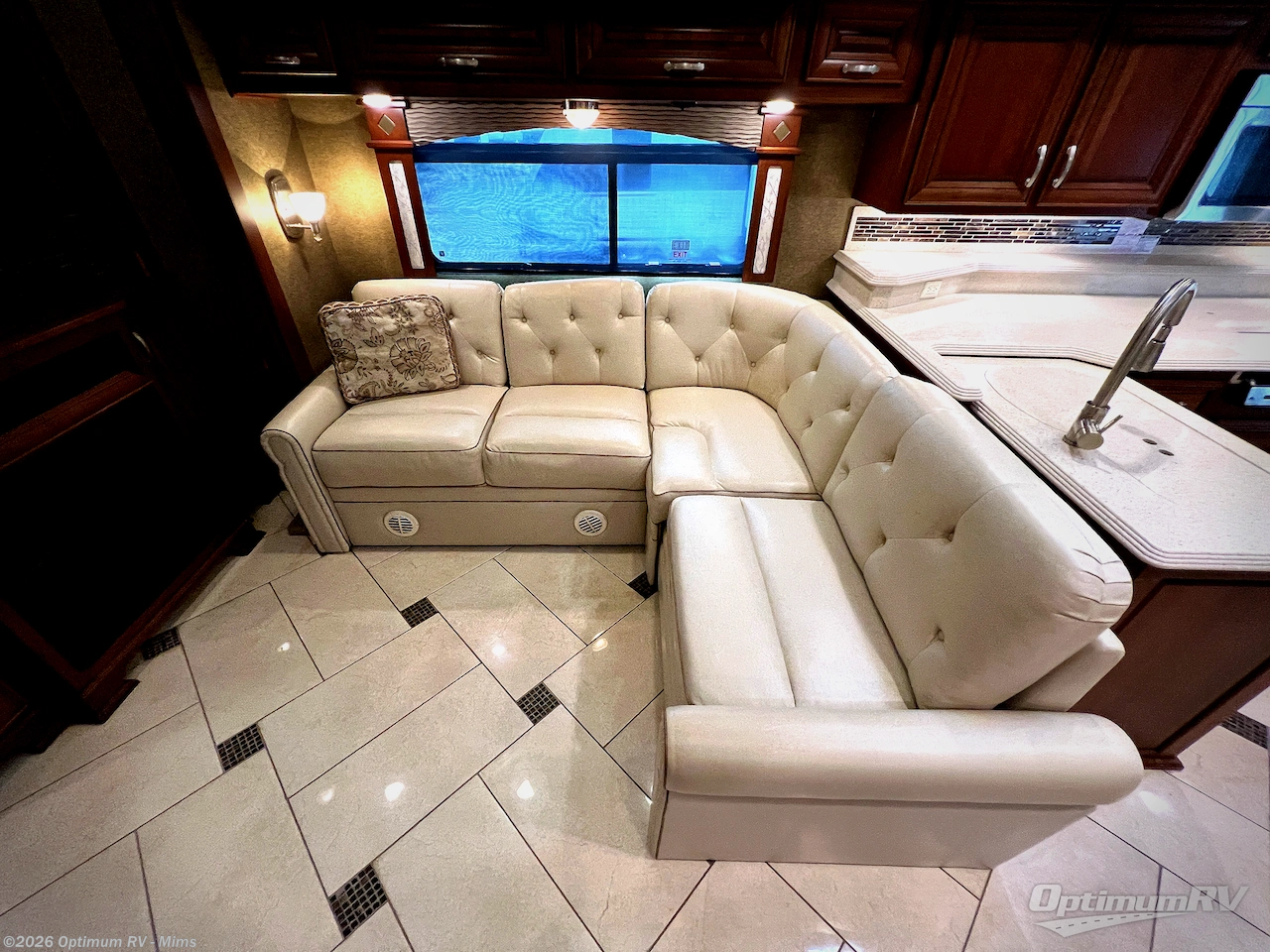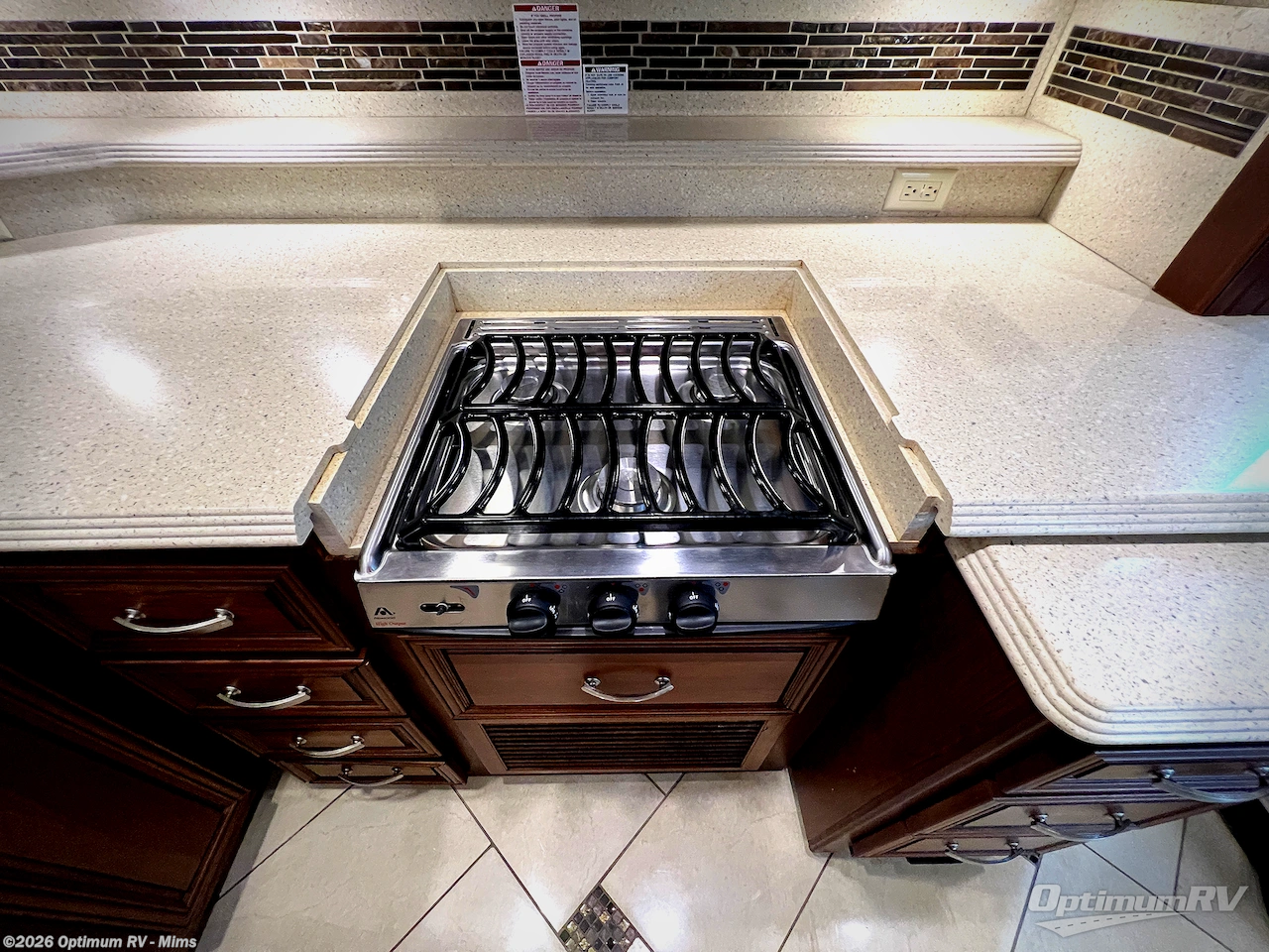 As you enter the motor home, on the left side there is a slide with a refrigerator, table, and lounge chair. The opposite slide offers a set of pullout drawers, three burner range, double kitchen sink, and an extendable sectional sofa slide. Along the rear wall there is a 32" LED TV for you to enjoy.
