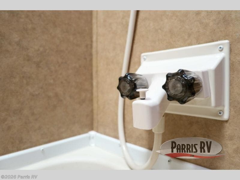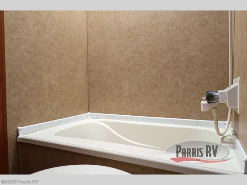 The bathroom is located in the rear of the travel trailer. There is a sink, toilet, and tub. You will also notice a private entrance from the bathroom to outside.