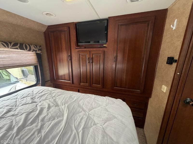 Back at the front, the area over the cab comes standard with storage and a 54" x 80" bunk, or you may choose an optional entertainment center. Other options may include a TV for the bedroom or a deluxe TV for the living area.