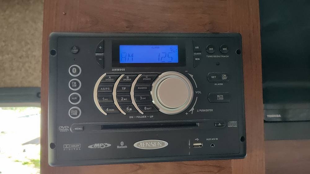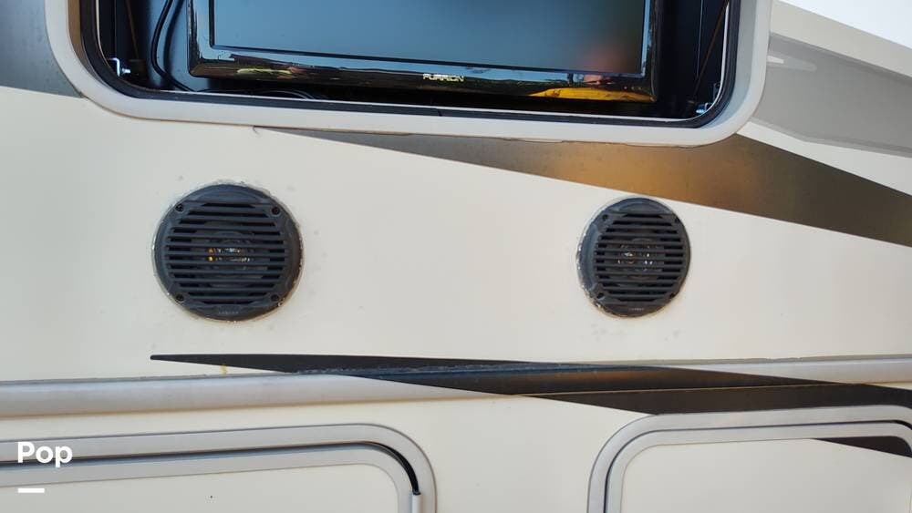 The exterior has an exterior TV with speakers for both the stereo and the TV.