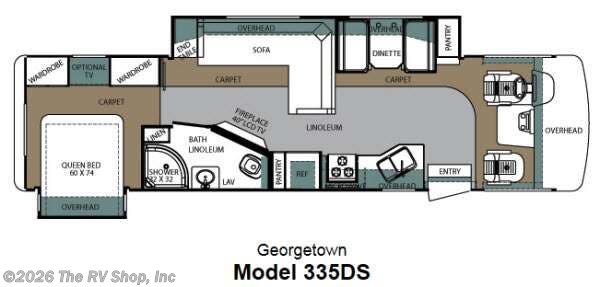 As you enter the Georgetown 335DS motor home by Forest River you will see to your left, a double kitchen sink, three burner range, microwave, refrigerator and panty. On the opposite side of the motor home, there is a pantry, dinette, l-sofa, and end table slide. The 40" LCD tv and fireplace can be enjoyed from the l-sofa. The bathroom has a linen, corner shower, sink, and toilet. As you enter the bedroom you will find two wardrobes, and a queen size bed slide. This motor home offers plenty of overhead cabinets space throughout. You have the option to even choose a tv in the bedroom!