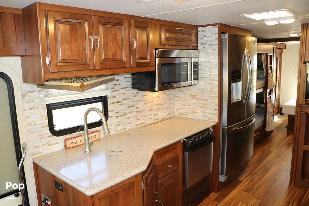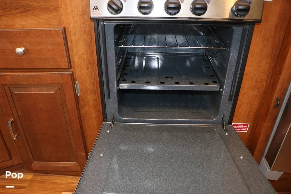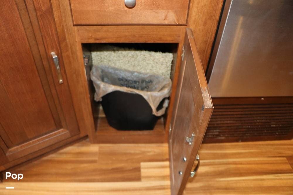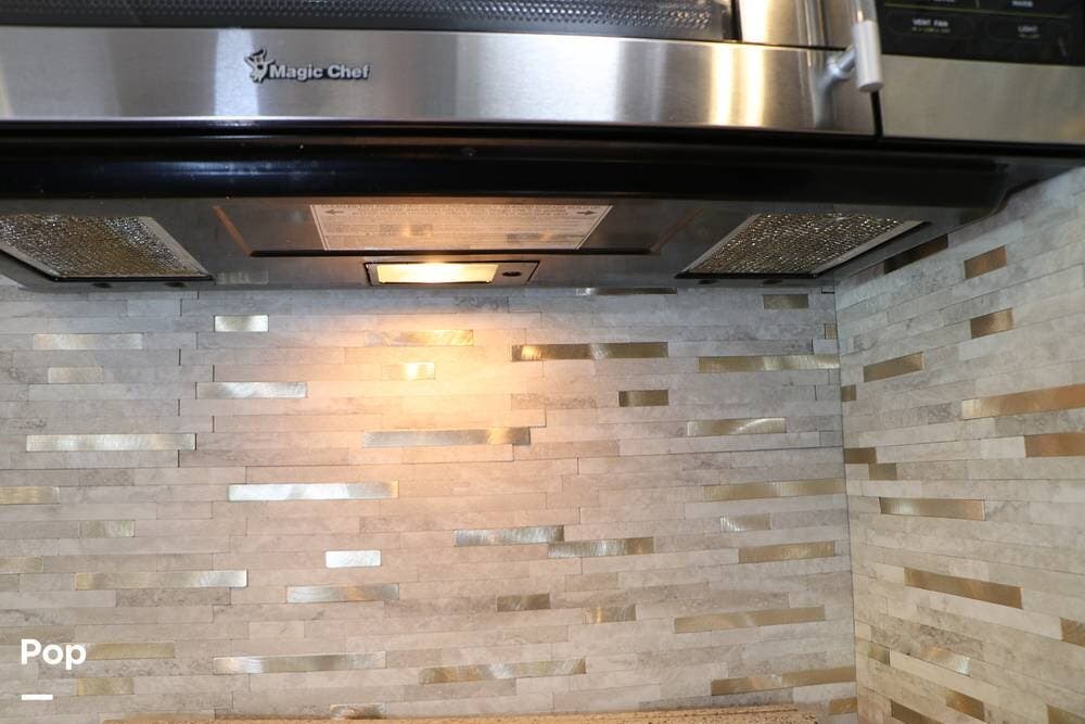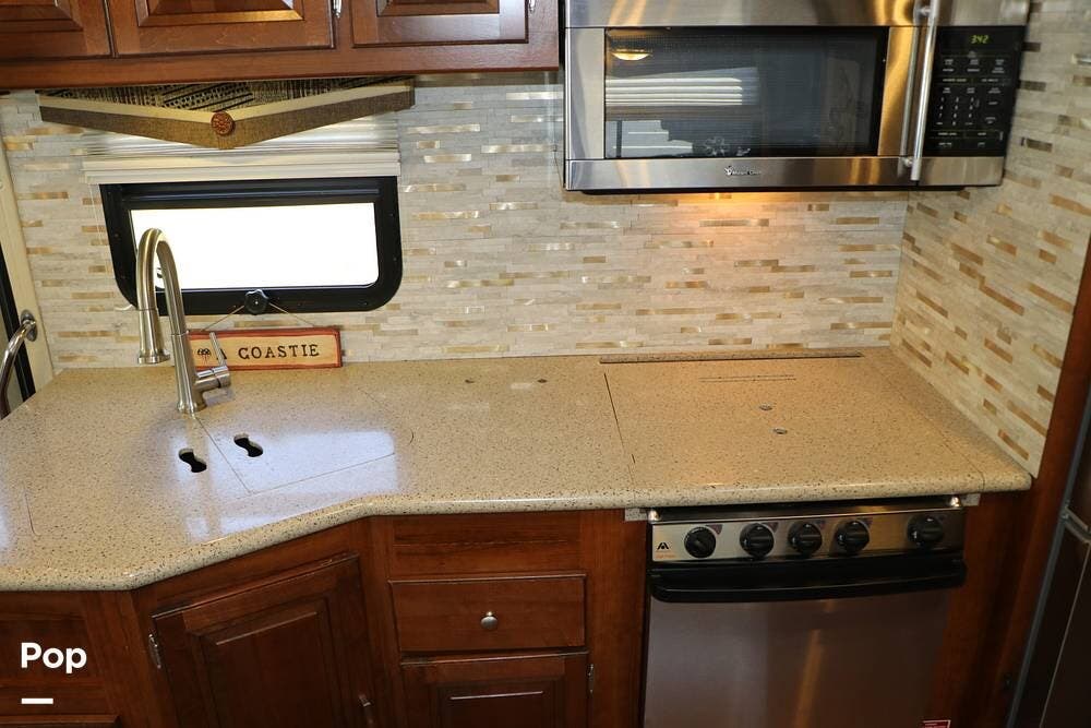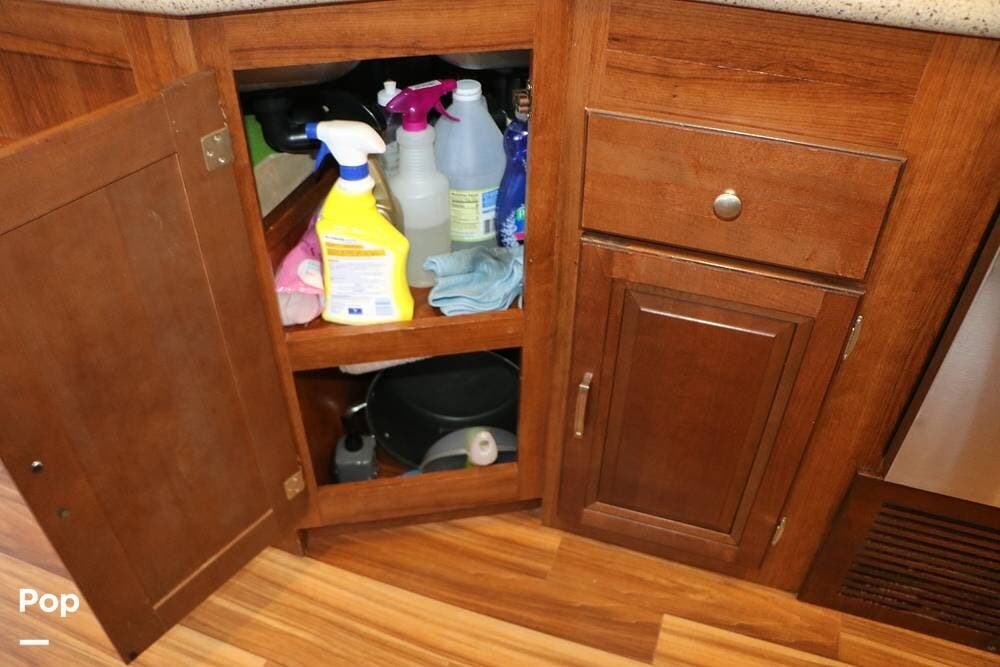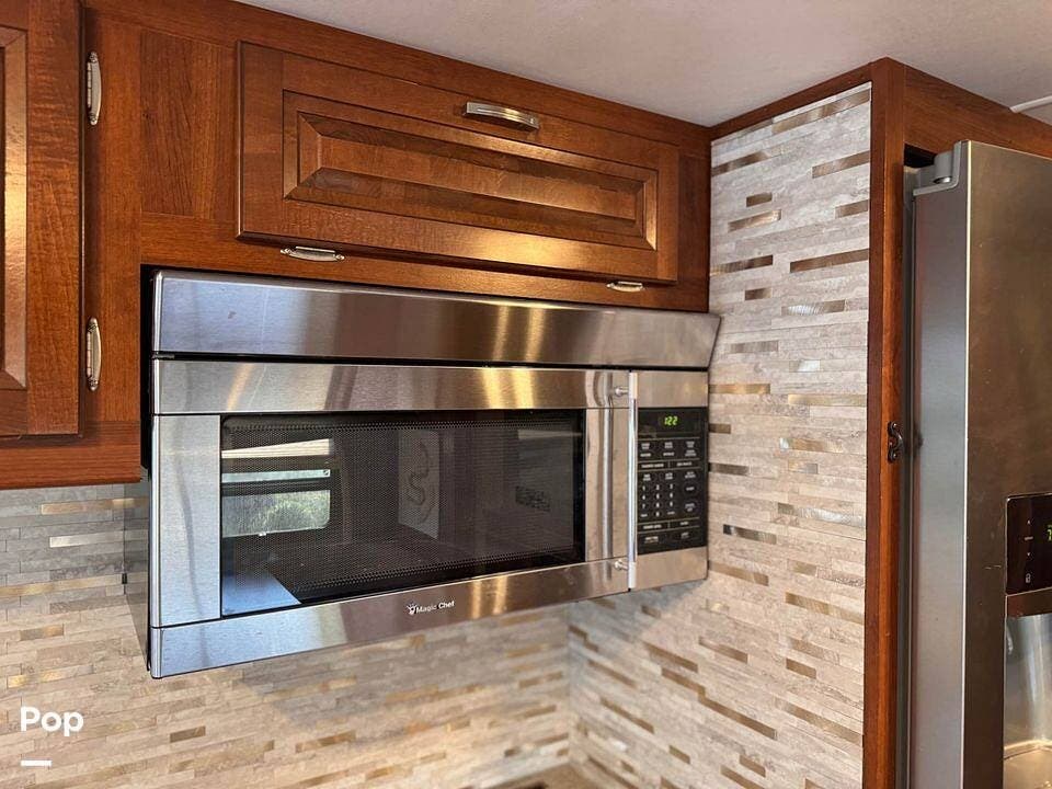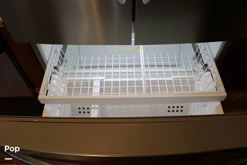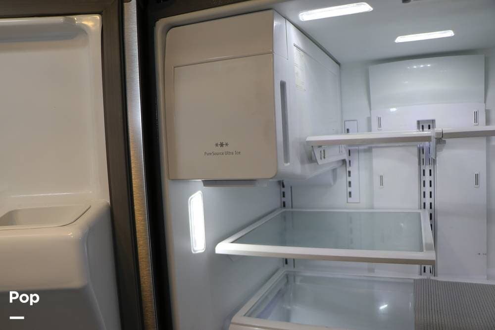 The Galley is fully equipped with a double kitchen sink (stainless steel) and a gooseneck faucet - with matching covers - to the solid surface countertop. The seller redid the entire backsplash - and it shows very well! The microwave over a range hood vent/fan and the stove top with three burners - also has matching covers to the solid surface countertop. There is a conventional oven below the 3-burner stove top. The residential 3-door refrigerator/freezer with in-door water and ice dispenser really sets this RV apart from units with a smaller refrigerator. There is plenty of storage space above and below the countertops and overhead the dinette and sofa too!