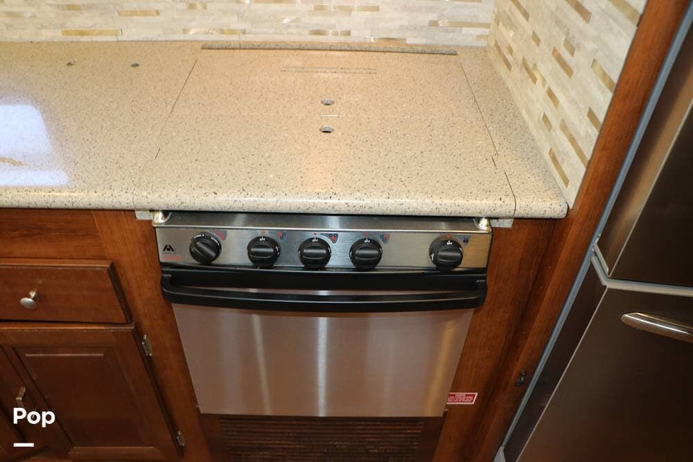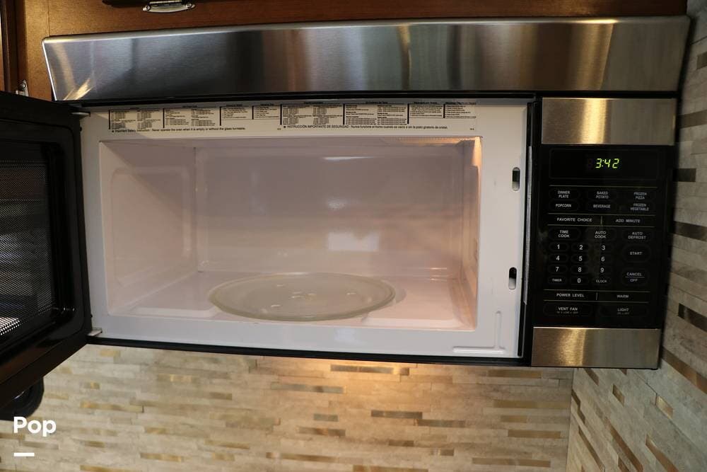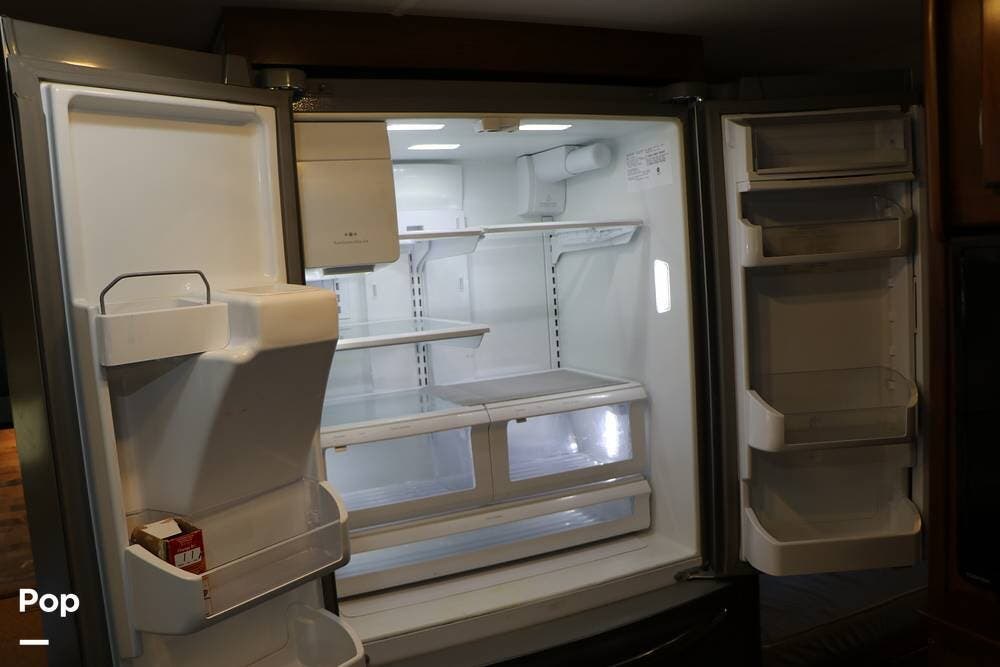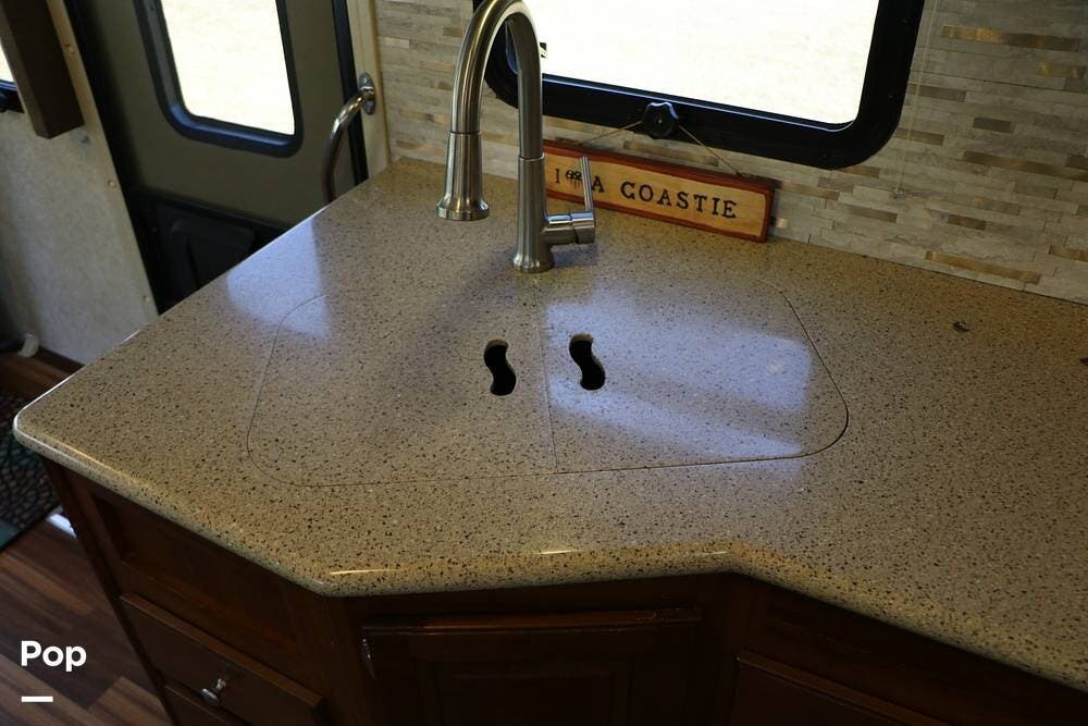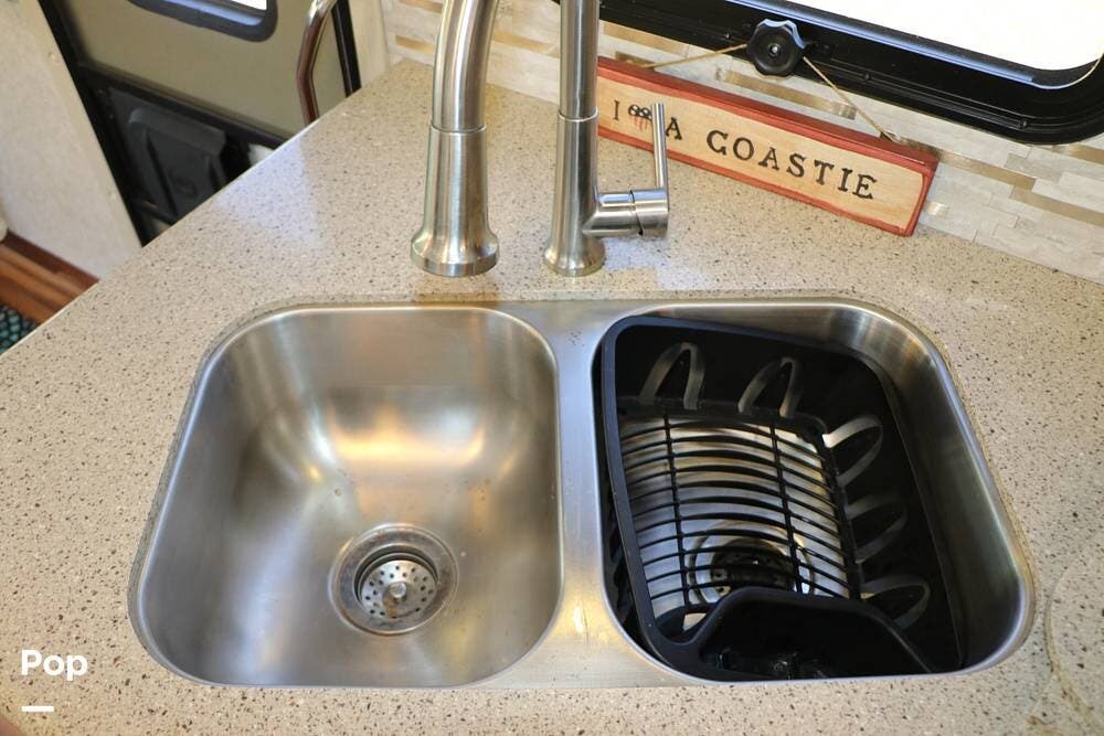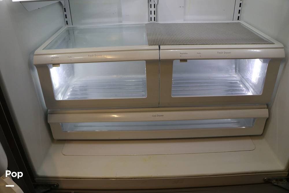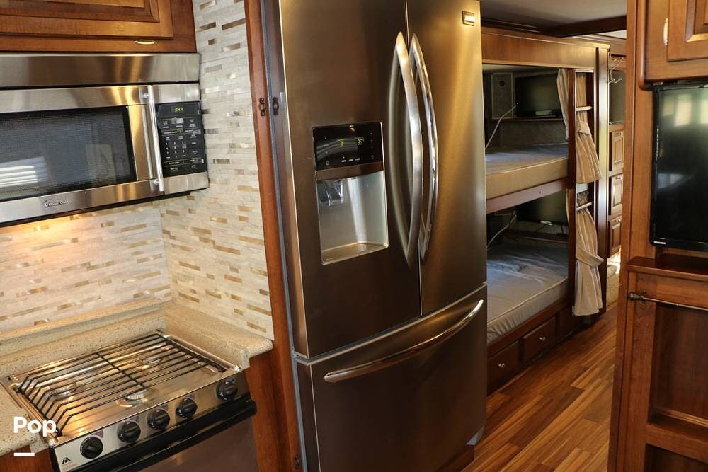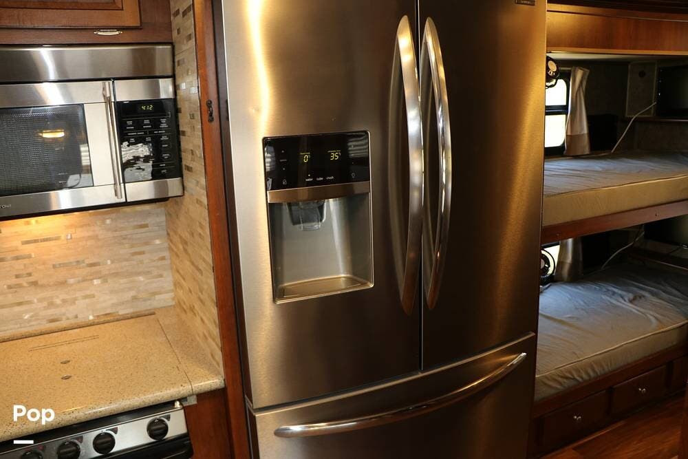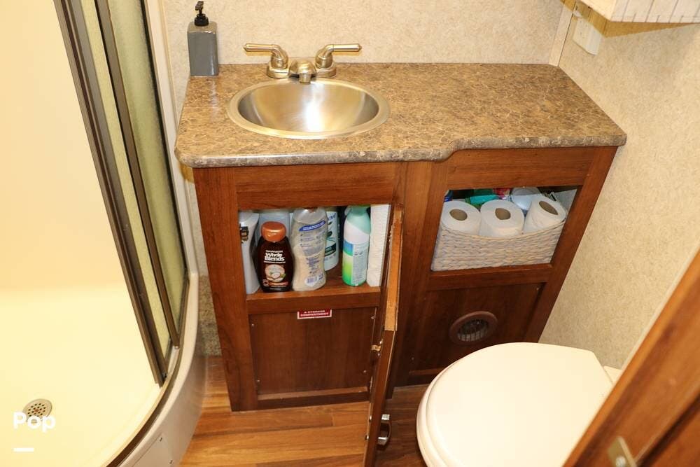 The Galley is fully equipped with a double kitchen sink (stainless steel) and a gooseneck faucet - with matching covers - to the solid surface countertop. The seller redid the entire backsplash - and it shows very well! The microwave over a range hood vent/fan and the stove top with three burners - also has matching covers to the solid surface countertop. There is a conventional oven below the 3-burner stove top. The residential 3-door refrigerator/freezer with in-door water and ice dispenser really sets this RV apart from units with a smaller refrigerator. There is plenty of storage space above and below the countertops and overhead the dinette and sofa too!