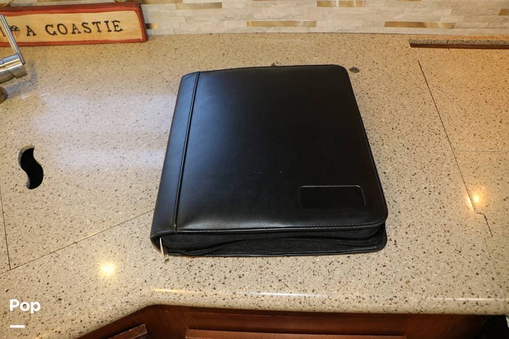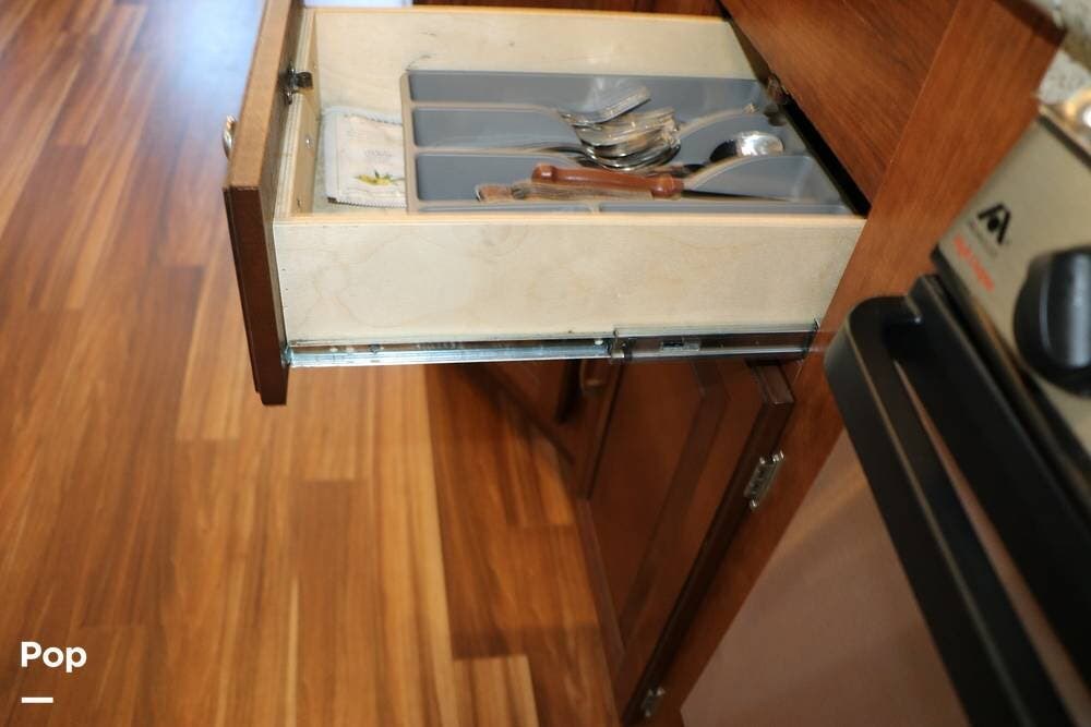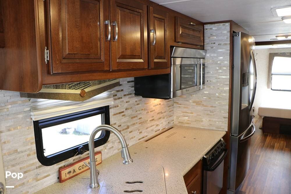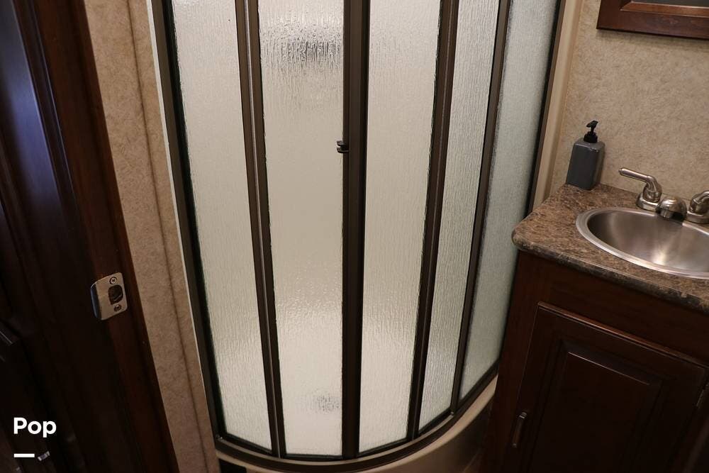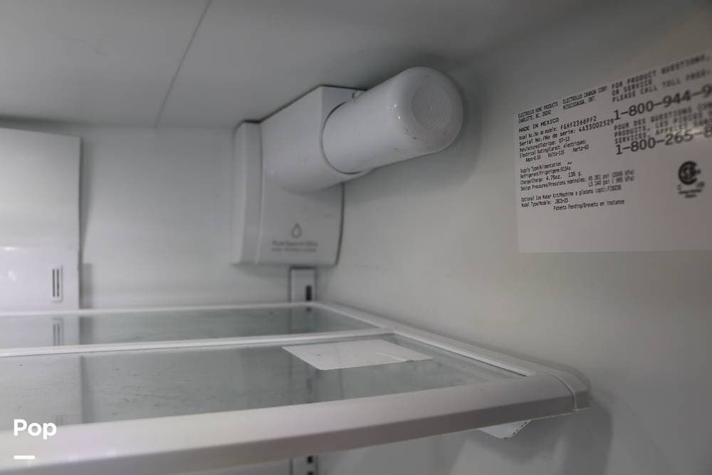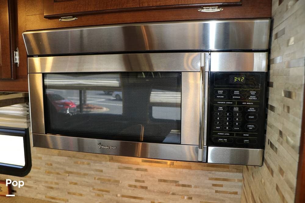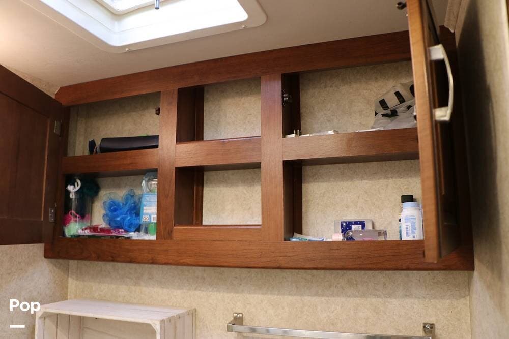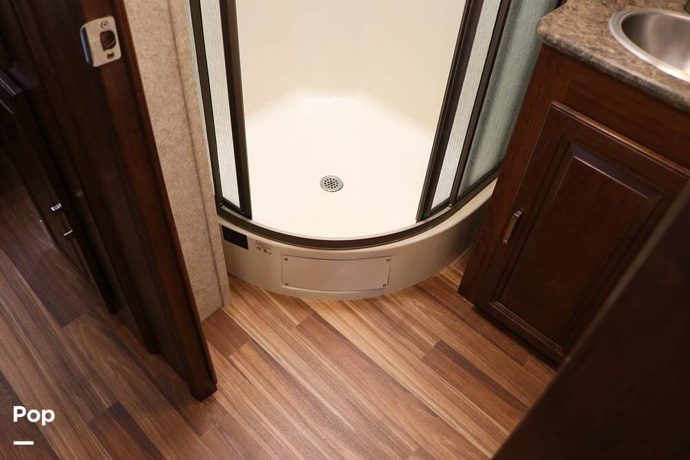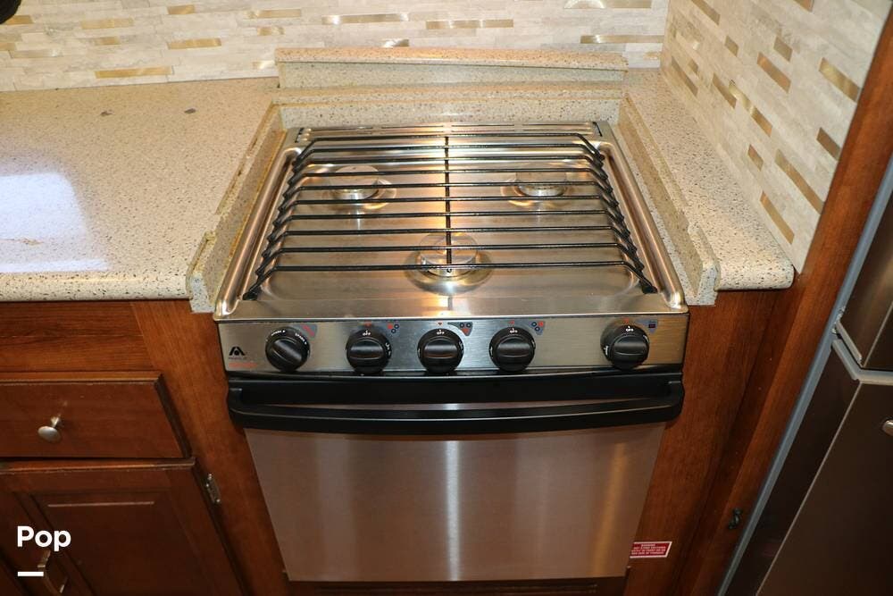 The Galley is fully equipped with a double kitchen sink (stainless steel) and a gooseneck faucet - with matching covers - to the solid surface countertop. The seller redid the entire backsplash - and it shows very well! The microwave over a range hood vent/fan and the stove top with three burners - also has matching covers to the solid surface countertop. There is a conventional oven below the 3-burner stove top. The residential 3-door refrigerator/freezer with in-door water and ice dispenser really sets this RV apart from units with a smaller refrigerator. There is plenty of storage space above and below the countertops and overhead the dinette and sofa too!