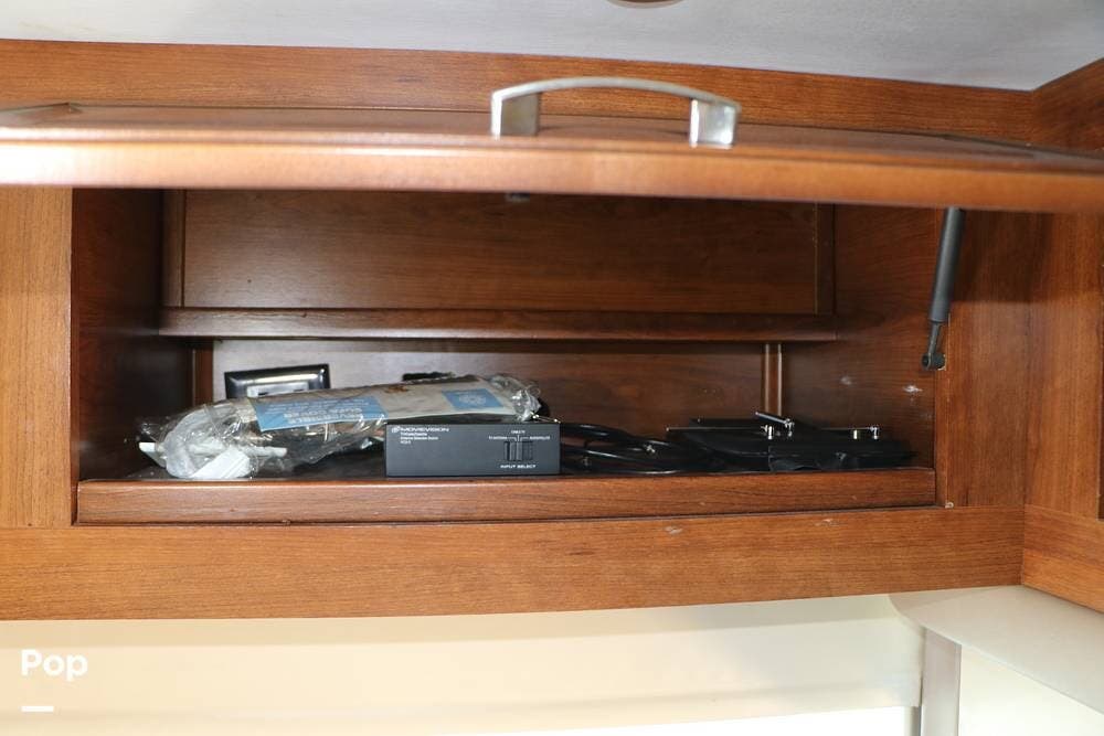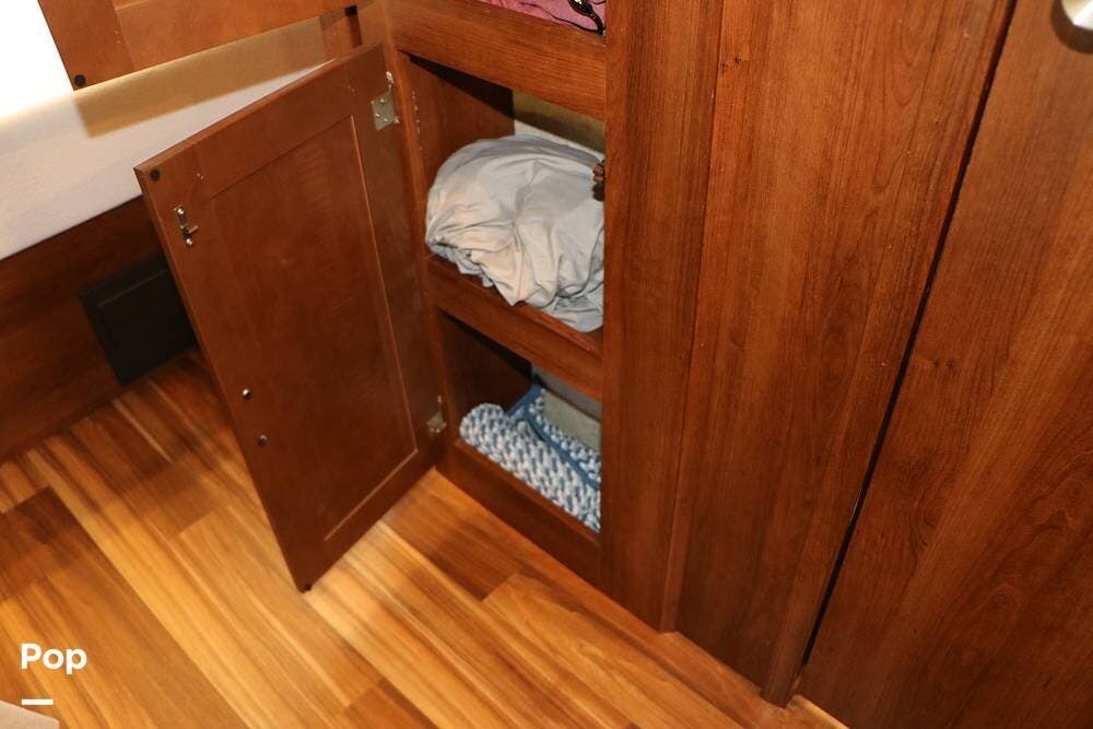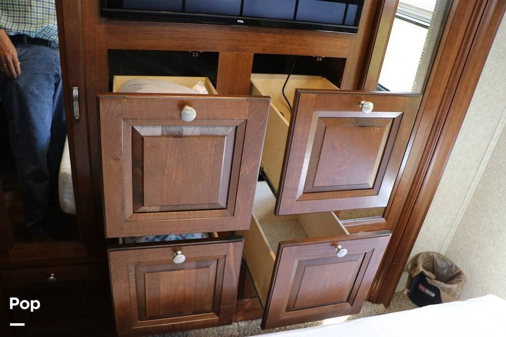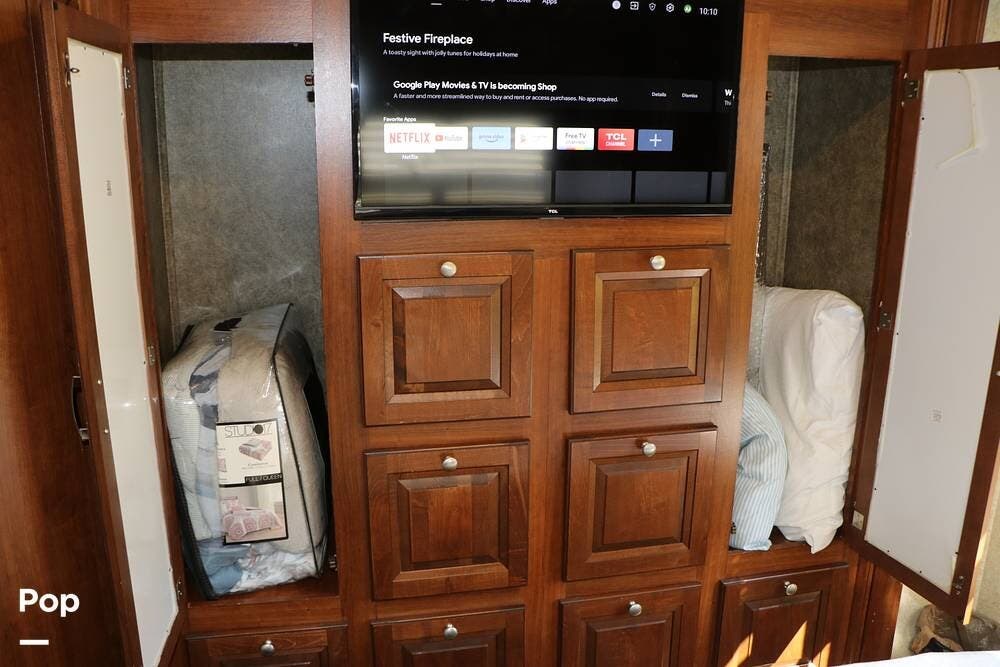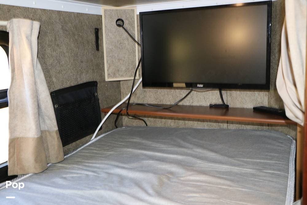 The master bedroom has a pocket privacy door - a pedestal queen bed with nightstands on both sides of the bed, overhead cabinets, and storage space below the bed, and at the foot of the bed, there is a full wall wardrobe closet and dresser - plus a wall-mounted flat-screen smart TV!