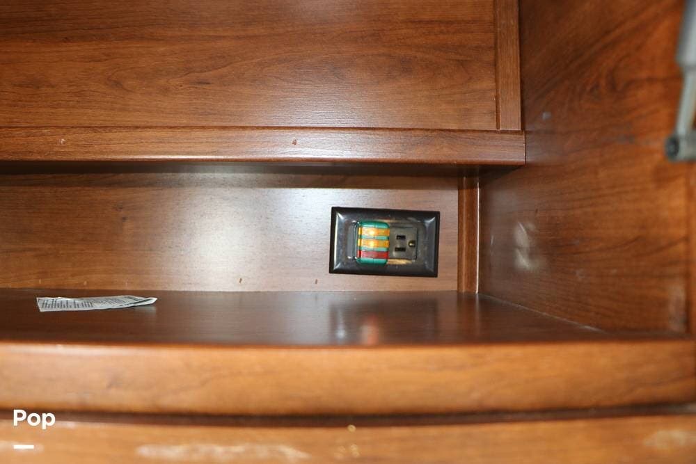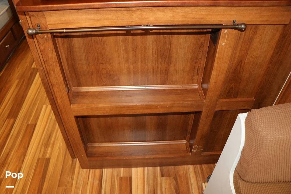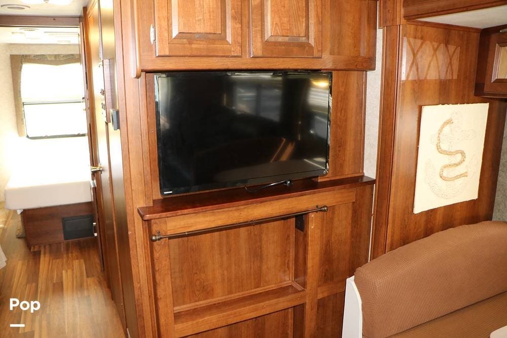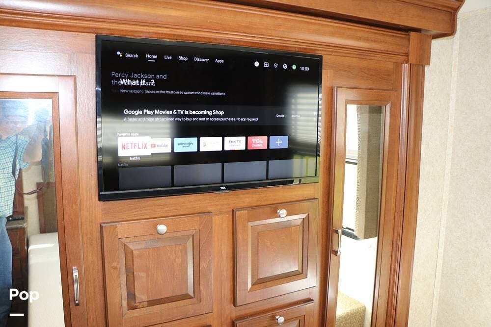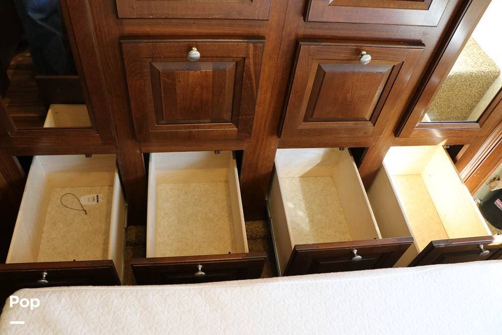 The master bedroom has a pocket privacy door - a pedestal queen bed with nightstands on both sides of the bed, overhead cabinets, and storage space below the bed, and at the foot of the bed, there is a full wall wardrobe closet and dresser - plus a wall-mounted flat-screen smart TV!