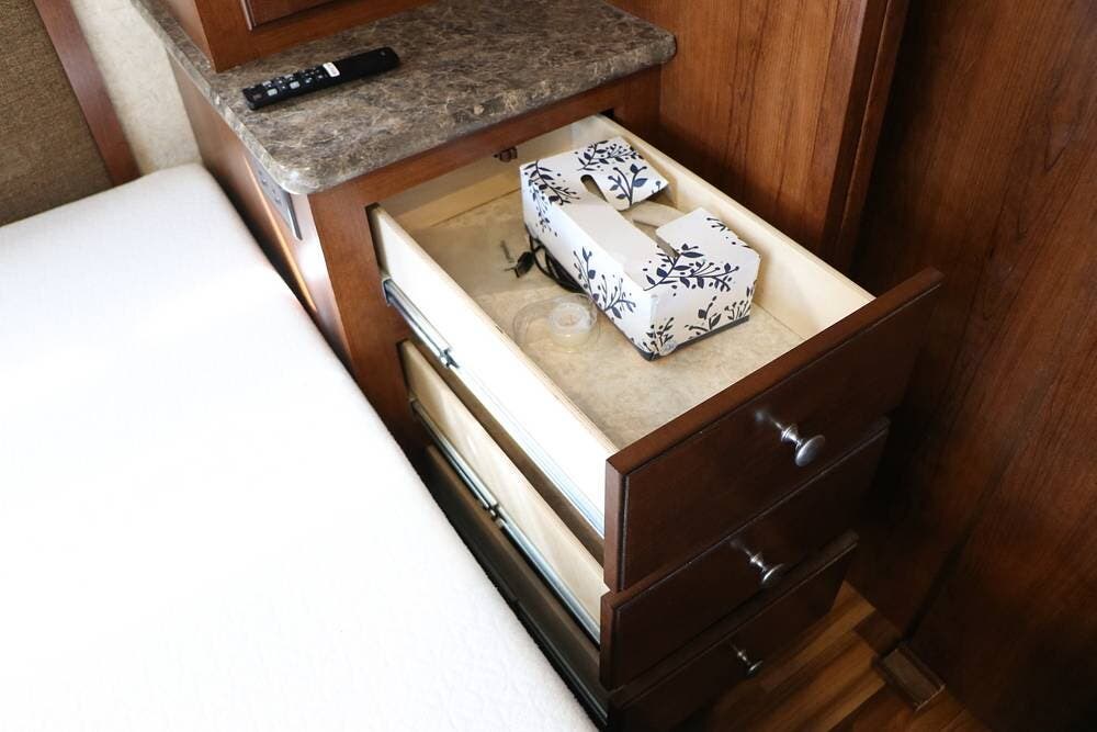 The cab area has all of the capabilities you would expect--an auto-leveling system with 4 jacks, remote-controlled mirrors, and turn signal cameras in addition to the backup/rearview camera, so you have great visibility when driving or backing up. The stereo system and Bluetooth connectivity to your smartphone make this one a breeze to set up and enjoy your favorite tunes while on the road.