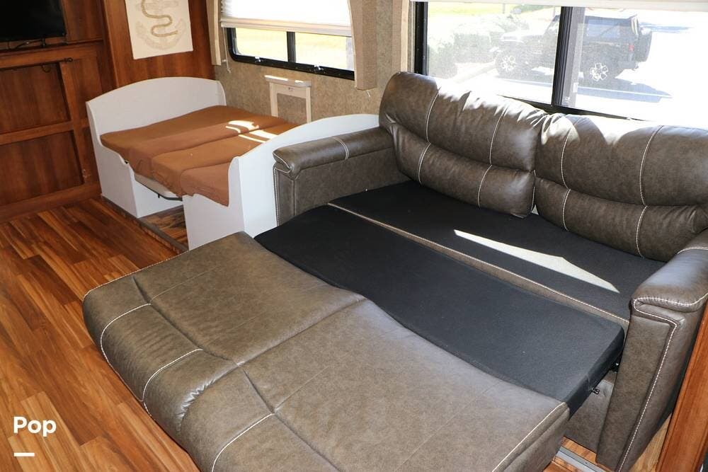 There is sleeping for up to eight, with the tri-fold sleeper sofa immediately across from you when you enter the RV. By day, it is a super comfortable sofa; by night, it quickly converts into a full-size bed. The dinette can quickly convert into another full-sized bed, and of course, the two bunk beds and the master bed in the back.