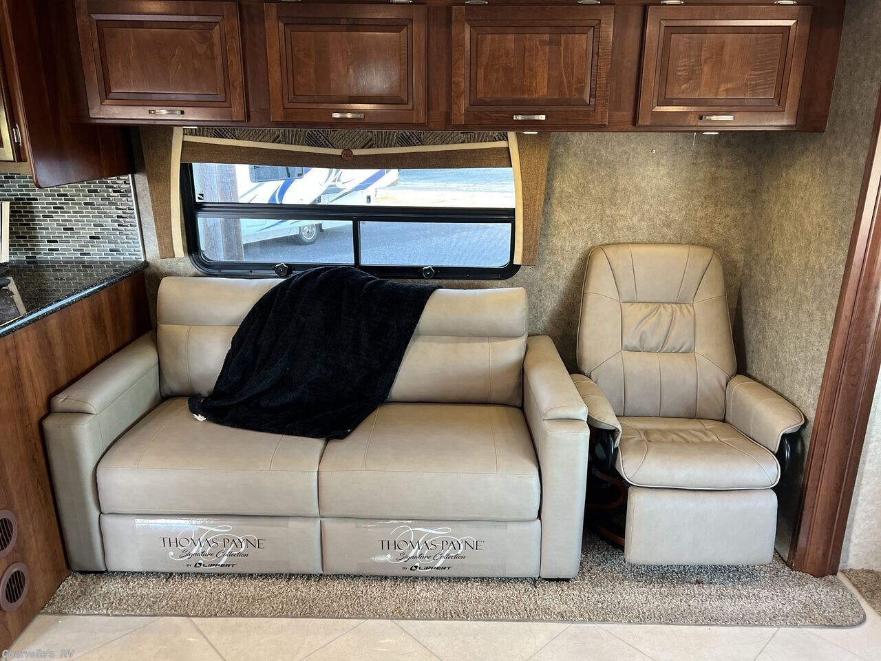 Inside, you’ll enjoy upscale, residential-style comforts designed for extended getaways. The kitchen shines with solid surface countertops, a residential refrigerator, and stainless appliances, complemented by a pantry and a practical kitchen sink. The living area holds leather furniture, a cozy fireplace, a TV with an antenna, and thoughtful lighting for relaxing evenings. Two recliners provide flexible seating, while the queen bed in the rear bedroom offers a private retreat after a day of exploring. The unit includes a washer/dryer combo for convenience, and day/night shades help you tailor light and privacy. This non-smoking floorplan delivers a clean, premium feel from front to back.