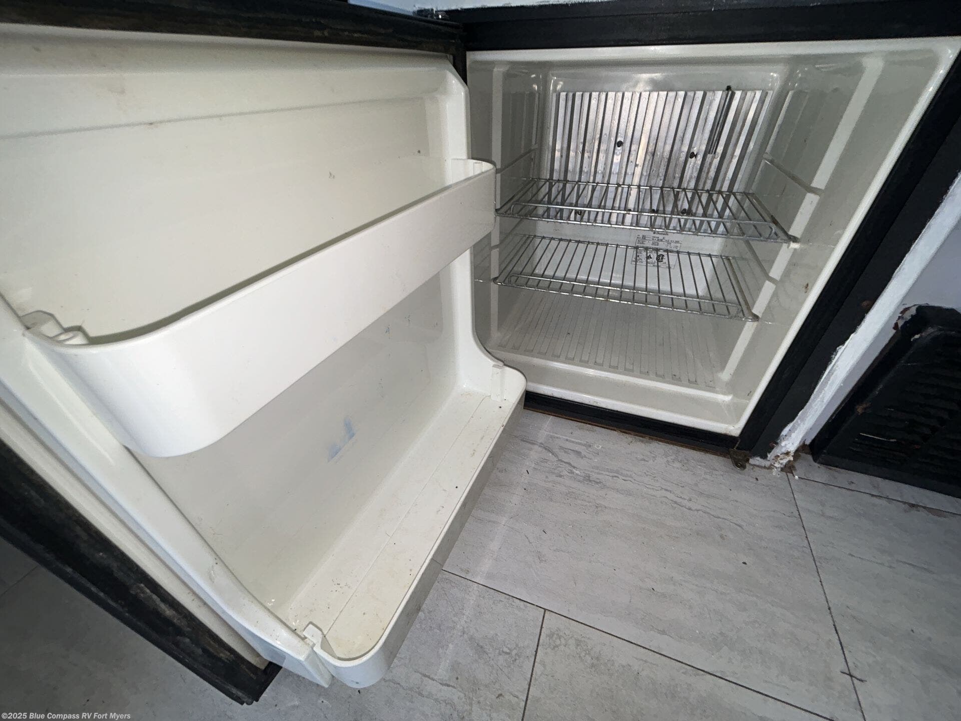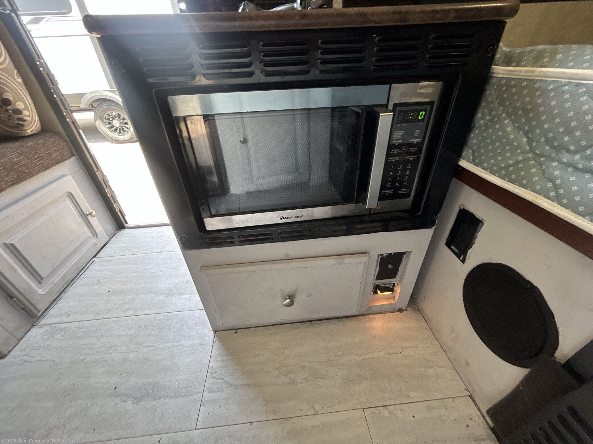 Across the back wall is a refrigerator, three burner range and a single bowl sink. The rear holds a 54" x 80" flip up bed with storage and the Cool Cat heat pump below it. A microwave cabinet is next to the door.