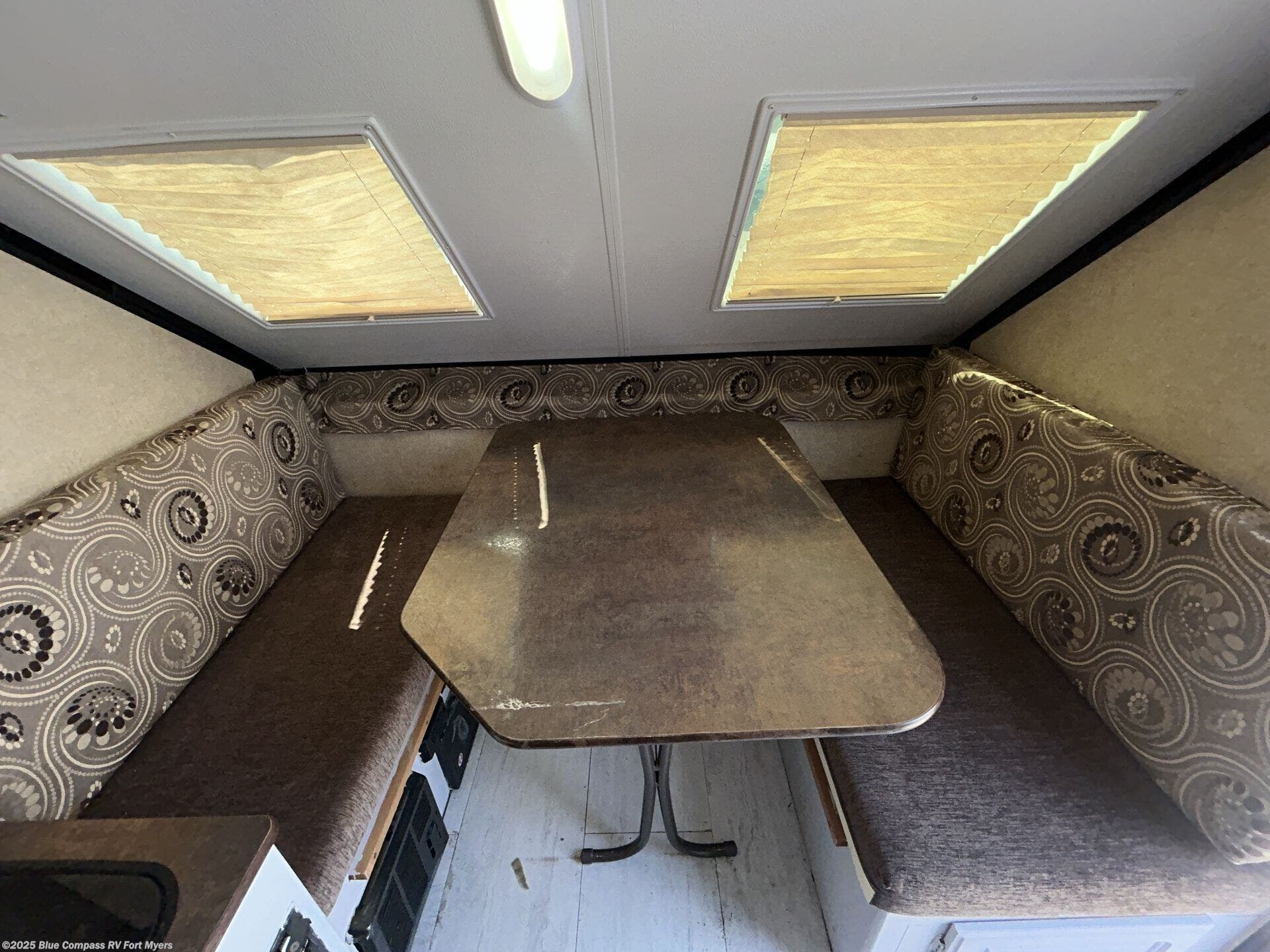 A 45" x 80" dinette is at the front. Under the far booth seat, you will find the water heater. An optional furnace could also be included here.
