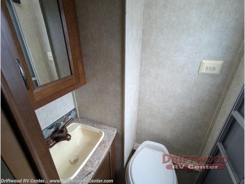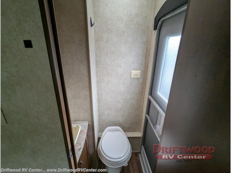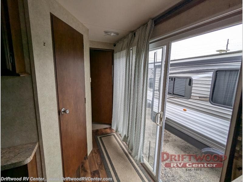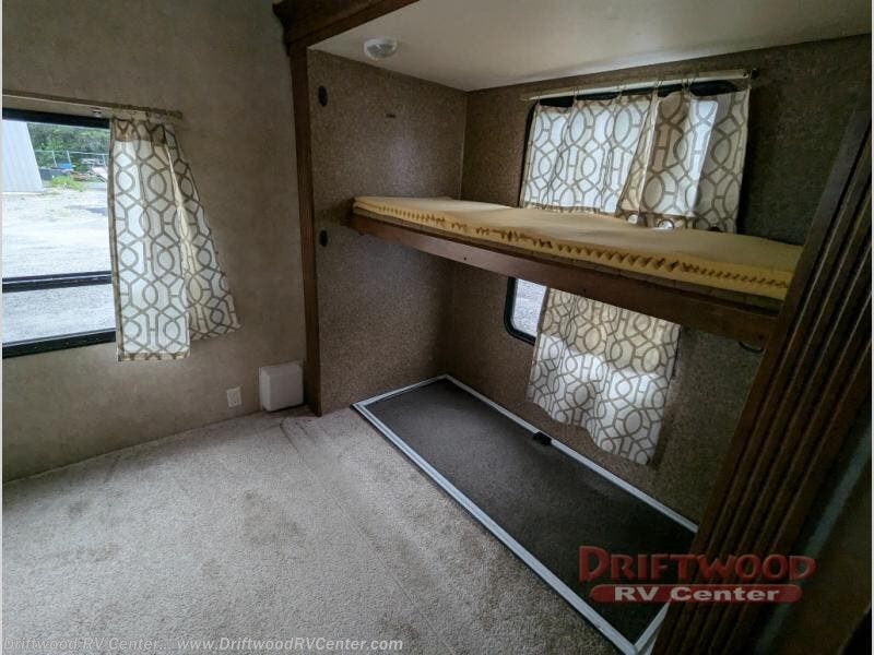In the rear of the trailer your kids can enjoy their own space with the bunk house. There are two slides. Each slide offers bunks. Off of the bunk room there is a convenient half bath with a door leading outside from the bathroom.